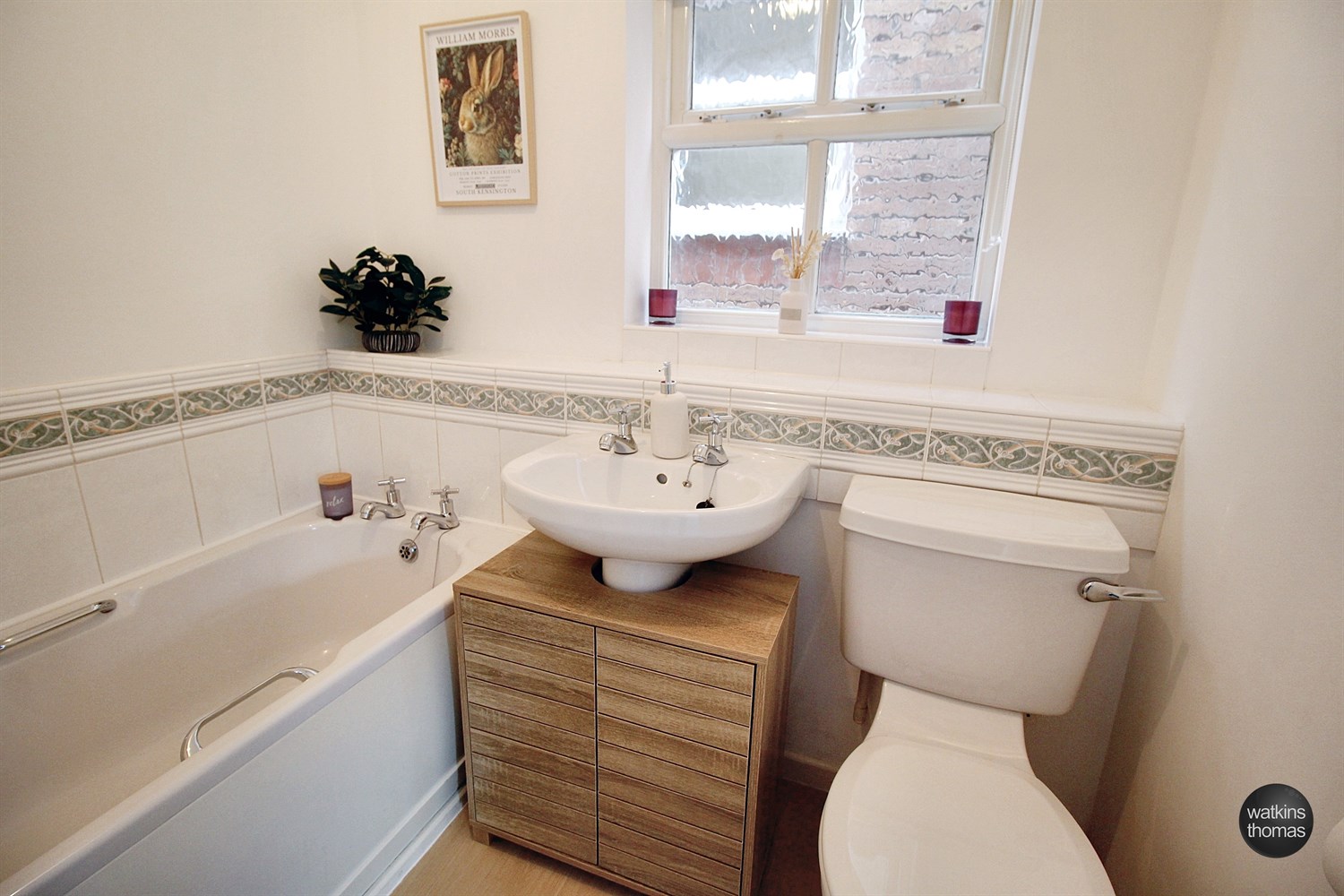 With side aspect double glazed window with fitted blinds. Suite comprising panel enclosed bath, pedestal mounted wash hand basin, low flush wc, partially tiled wall surrounds and panelled radiator.