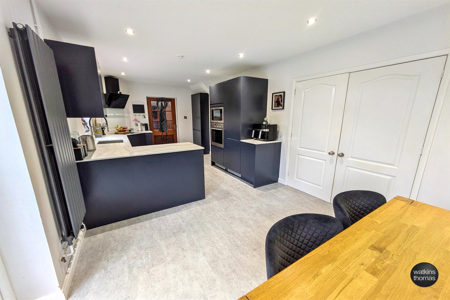 With rear aspect double glazed window. A range of units comprising sink drainer unit with Quartz work surface, base units under with matching wall units, integrated fridge freezer, integrated microwave and oven, electric hob with cooker hood over, cupboard housing the gas central heating boiler, inset spot lights, smoke alarm, side aspect glazed door to the side passageway and rear aspect double glazed French doors giving access to the rear garden.