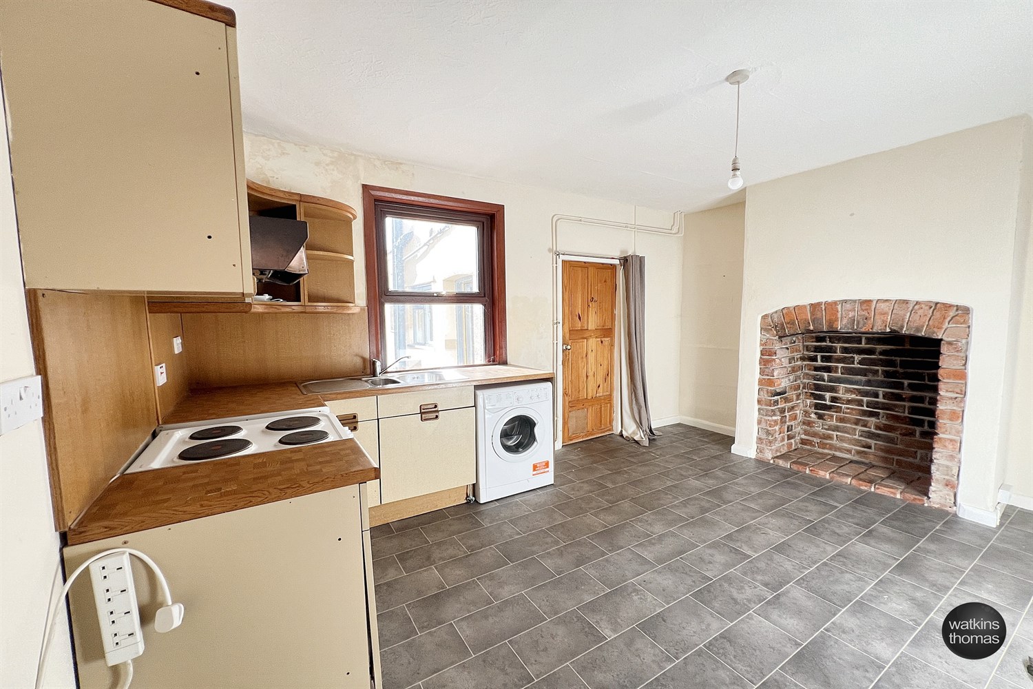With a double glazed window overlooking the rear garden to River Meadows. 1 bowl sink unit with drainer and mixer tap, fitted cupboards with working surface over and eye level cabinets, utility recesses, upright radiator and feature brick fire surround with arch over. Door to lower ground floor and door to: