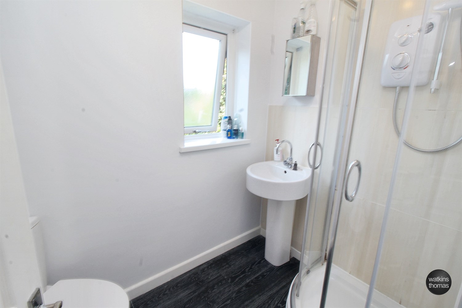 With low flush wc, pedestal mounted wash hand basin, shower cubicle with electric shower, laminated flooring, partially tiled wall surround and rear aspect double glazed window.
