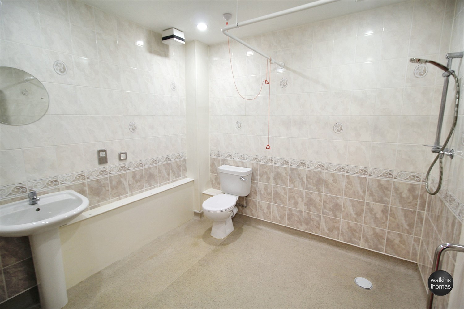 With low flush WC, pedestal mounted wash hand basin, wall mounted shower, fully tiled wall surround, wall mounted electric heater, waterproof flooring, extractor fan and shaver point.
