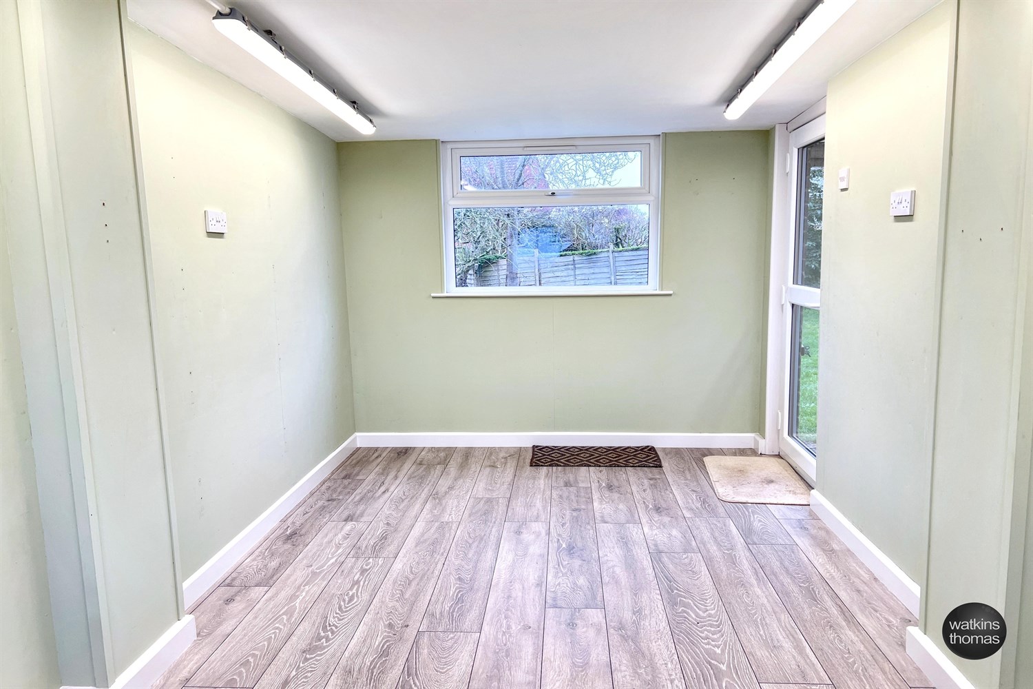 Now utilised as a workshop/store with a double glazed window to the front and rear, wood laminate flooring and double glazed door. The area is provided with electric light and power points.