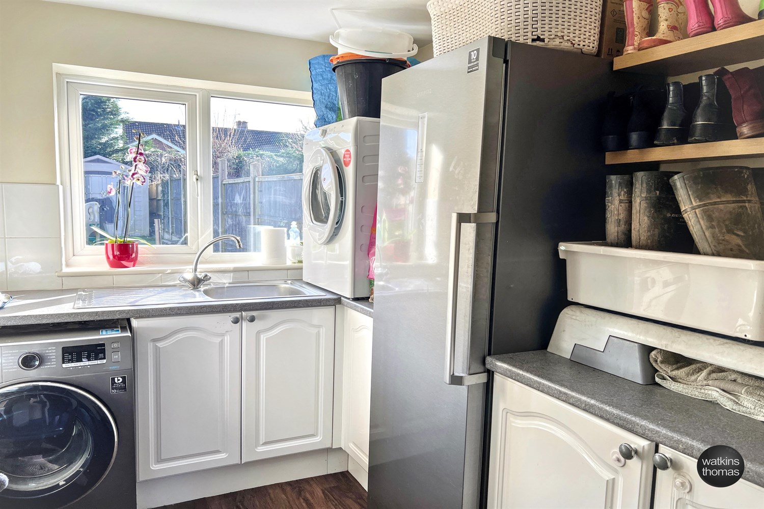 With a double glazed window to the rear and with a single drainer sink unit with mixer tap, fitted base cupboards with working surface over, tiled surrounds and recess with plumbing for washing machine. Radiator and wood grain effect flooring.