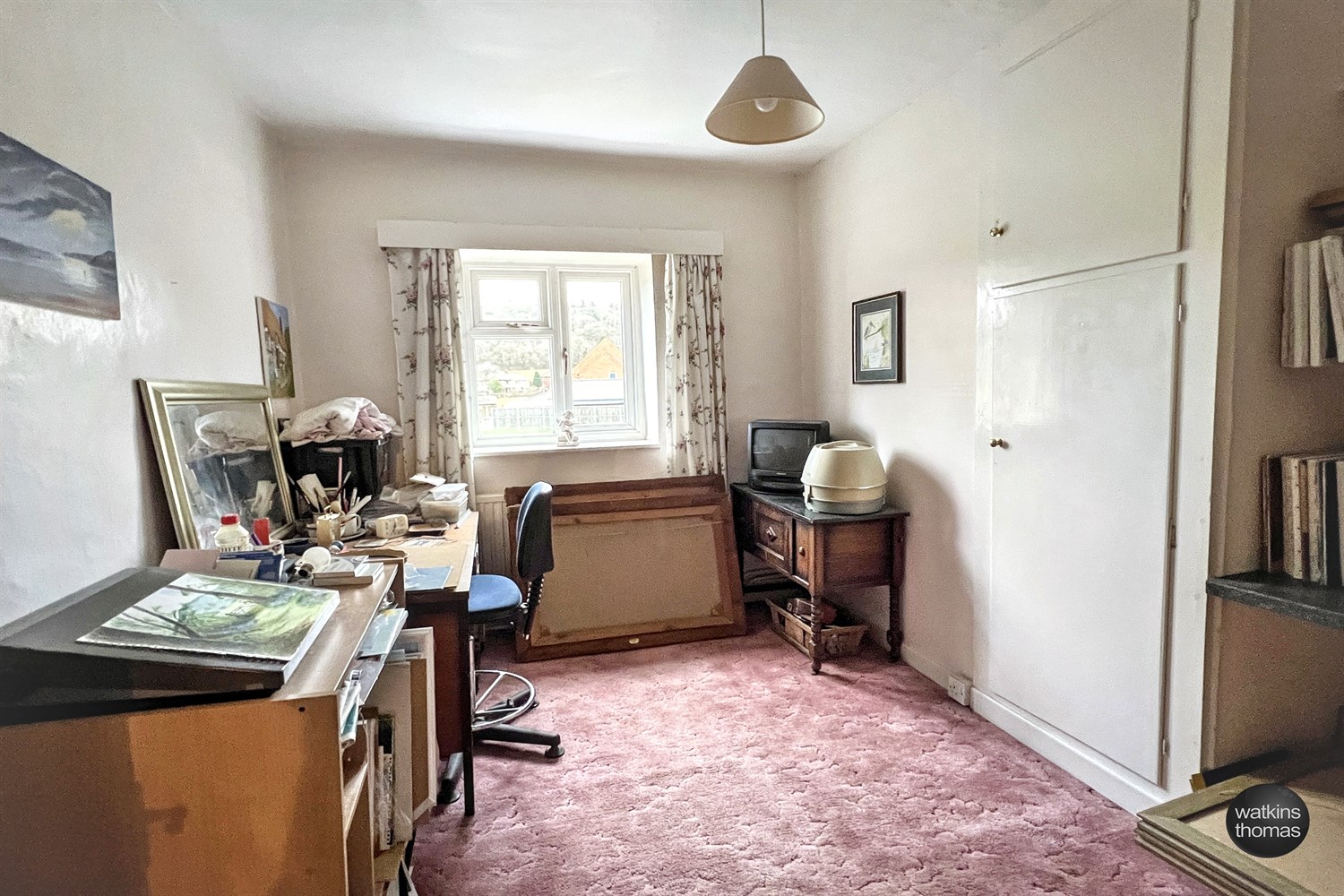 With a double glazed window to the front overlooking tree lined brook with rising tree lined countryside in the distance. Radiator and double doors to wardrobe cupboard with cabinets over.
