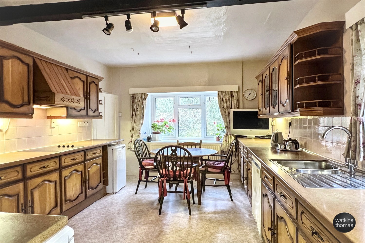 With double glazed windows to two aspects, again having the 8' 6 ceiling height, exposed beam and with wood fronted base cupboards with roll edge working surface over, tiled surrounds and eye level cabinets including a glass fronted unit and display ends, tall matching storage cupboard and having a one and a half bowl stainless steel sink unit with mixer tap and drainer, recess with plumbing for dishwasher, four ring hob and built in oven with grill below. Radiator and a central heating and domestic hot water control clock.