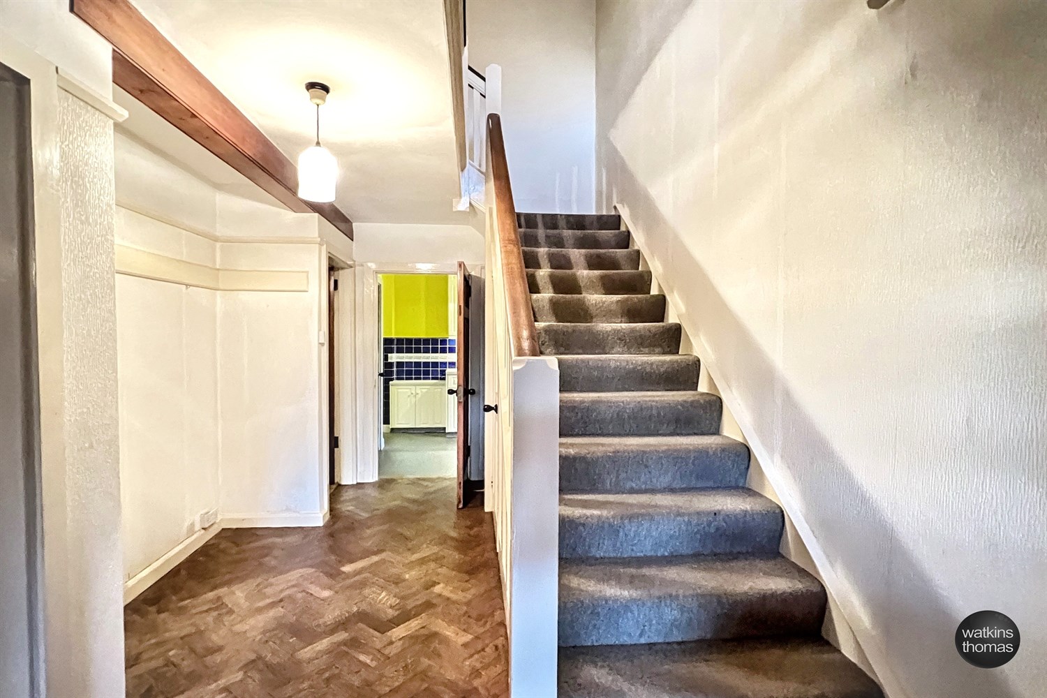 Picture rail, herringbone flooring, door to under stair cupboards with quarry tile floor, leaded window to the front, radiator and with doors to the kitchen, study, dining room and;