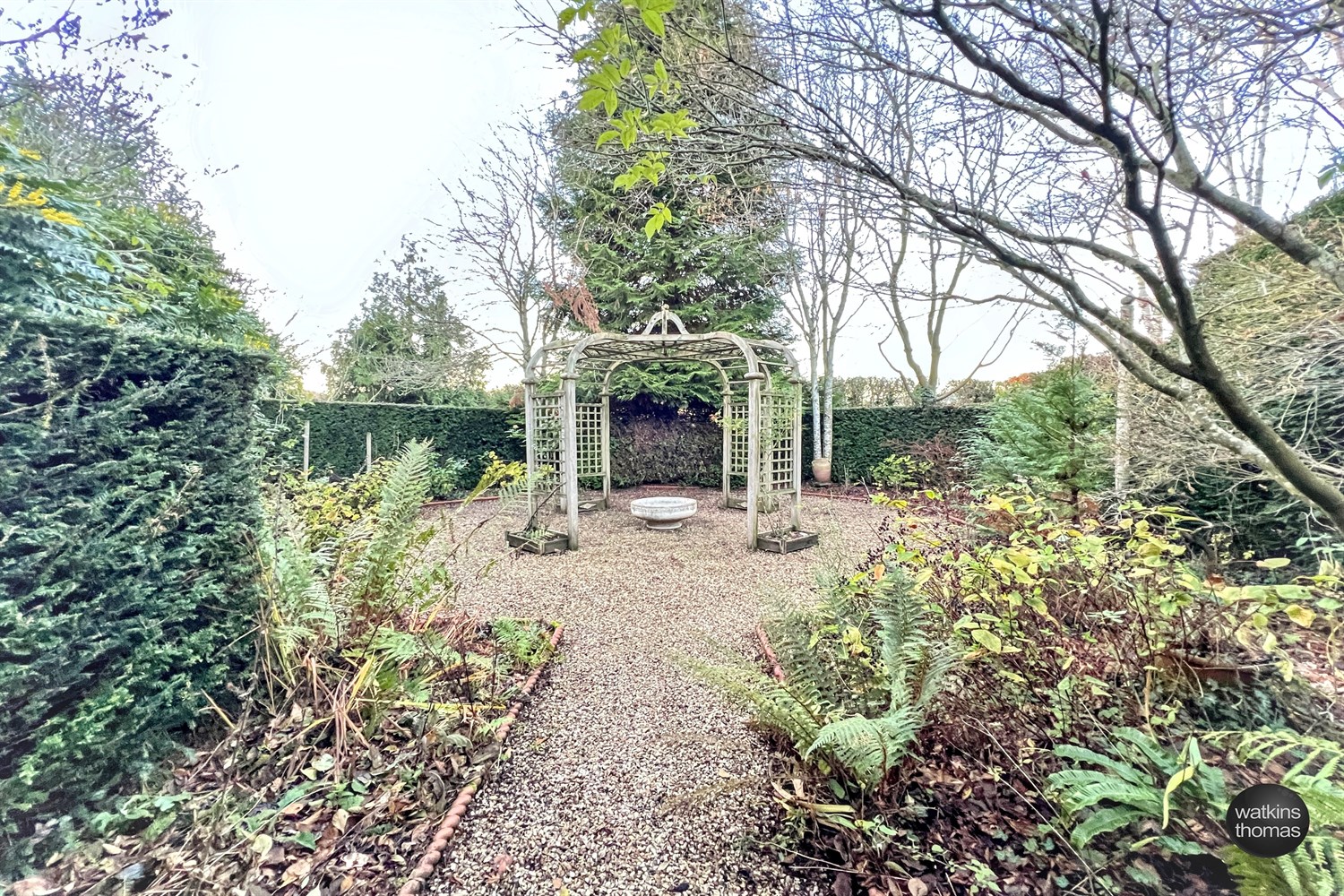 The property is approached over a splayed drive which runs to a pair of double wrought iron gates in a beach hedge which runs across the frontage and along the drive. The front gardens are lawned and interspersed with a wide variety of specimen trees and continue through formal lawns and a square of lawn at the front of the residence is bounded part by wrought iron work with a chipping stone pathway around an ornamental pond. At the side of the property there is a further lawned garden area with central circular patio, an area enclosed to the right by a dense evergreen hedge and by a row of mature firs with a pathway. At the side of the residence there are further lawns with a pergola walkway. Through the pergola there is a stone pathway with brick edge which runs to a feature bay. To the rear of the property there are further gardens with mature trees and the grounds continue up and behind the residence to a further wooded area. The garden and grounds run to about two acres and there is also a greenhouse, an arch with climbing roses over and a parade of silver birch trees, five on each side with a viewing area beyond. The driveway runs to a parking and turning area, off which is the: