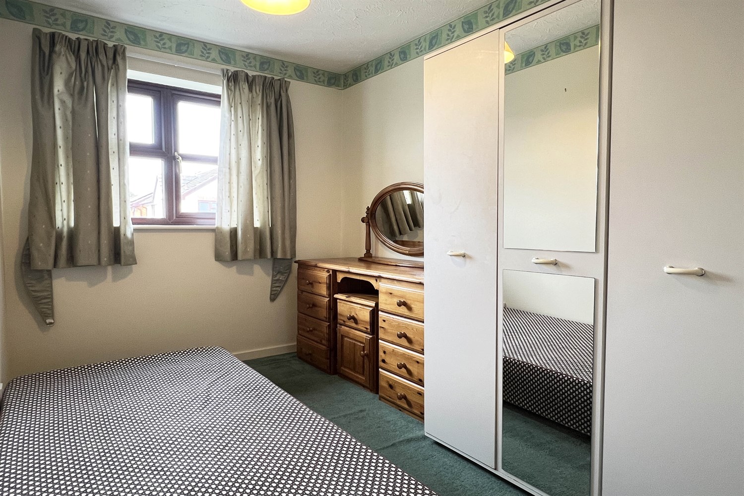 With a double glazed window overlooking the rear garden. Wall mounted panel heater, wall light point and with double sliding doors to a mirror wardrobe cupboard with fitted shelf.