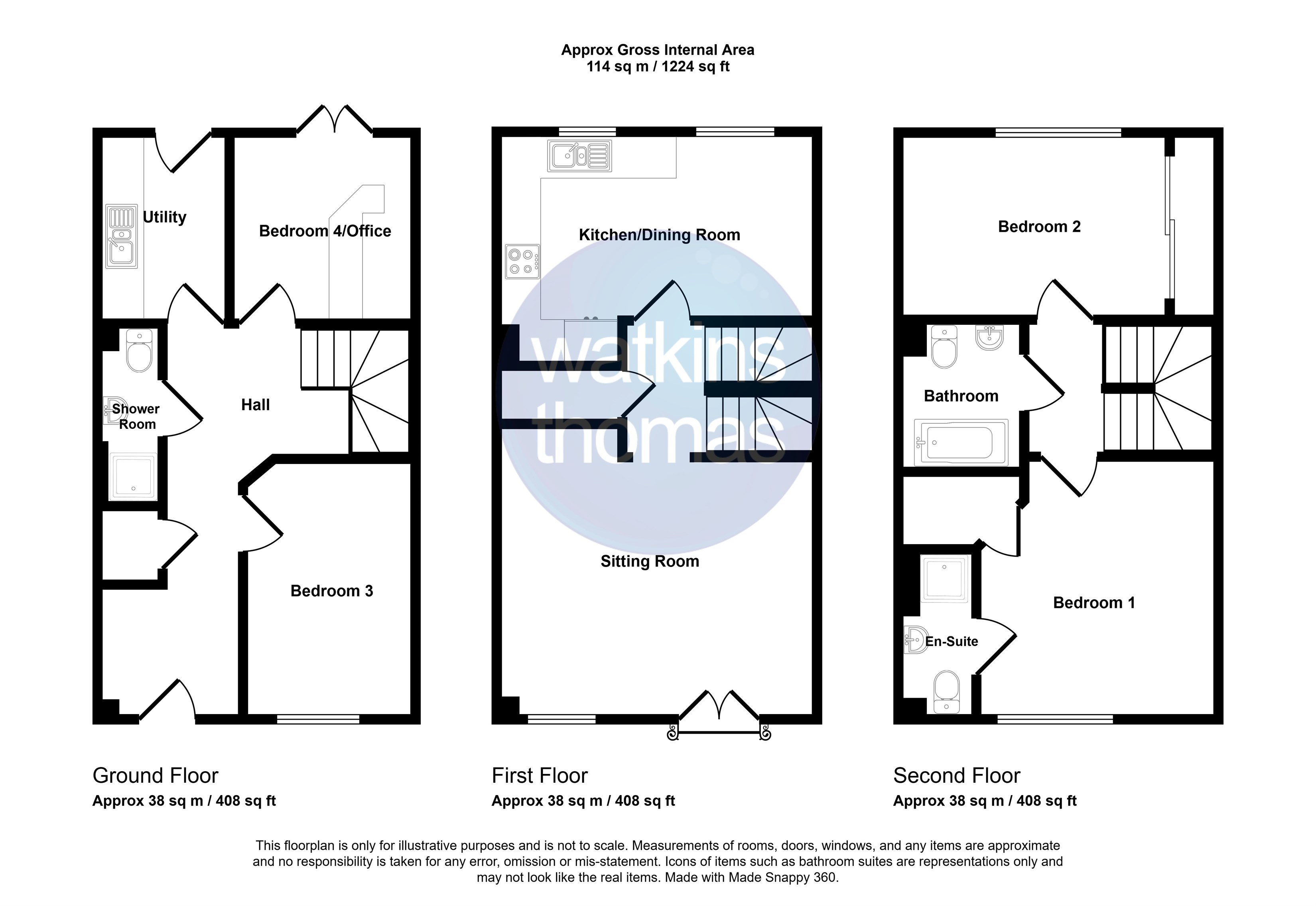 The subject property has the benefit of gas central heating, double glazing, off road parking for one vehicle and garage. The property comprises entrance hall, shower room, utility, two ground floor bedrooms, stairs from the ground floor lead to the first floor where there is a sitting room and kitchen/dining room, second floor landing gives access to bedroom 1 with en-suite shower room, bedroom 2 and family bathroom. In more detail the accommodation comprises: