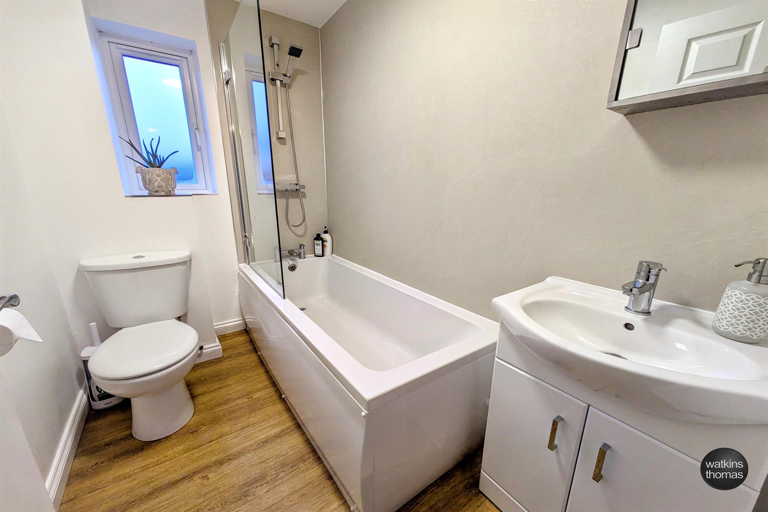 With a modern white suite comprising panel enclosed bath with thermostatically controlled shower over, mixer tap, glass shower screen, partially shower boarded surround, vanity wash hand basin, low flush wc, extractor fan, heated towel rail and LVT flooring.