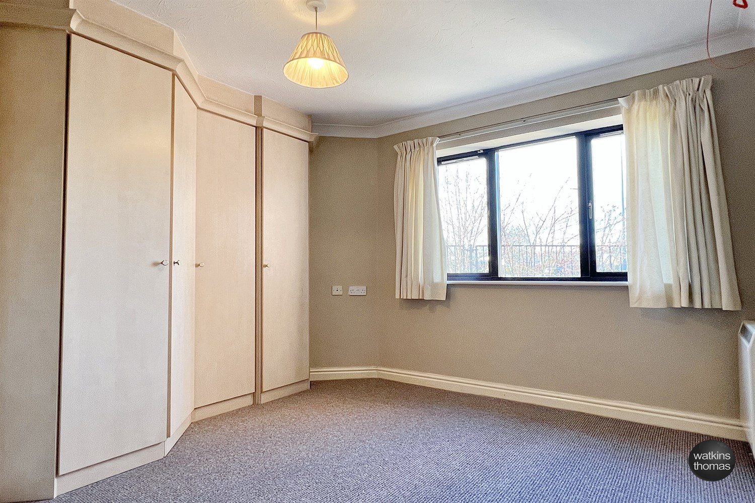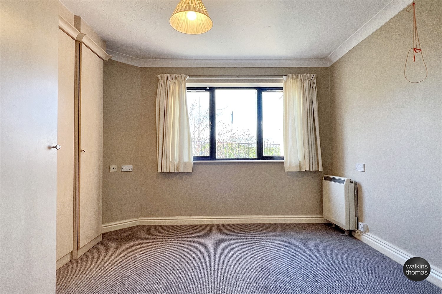 With a double glazed window with venetian blinds, coved ceiling, emergency alarm pull cord, night storage heater and with a shelf cupboard, cupboard with hanging rail and shelf, deep wardrobe cupboard with hanging rails and storage shelf and further shelved cupboard. Raised television point.