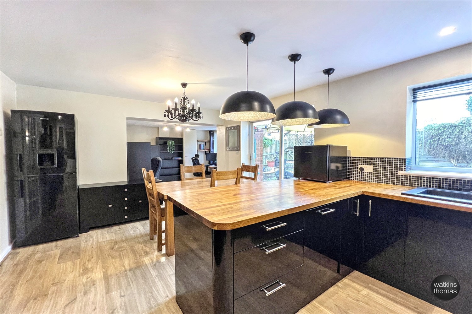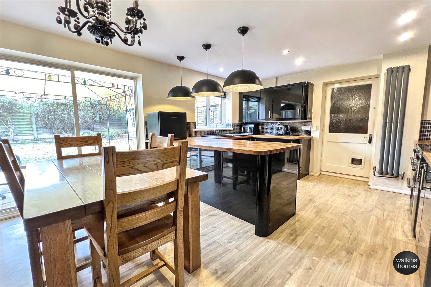 With double glazed window to the rear, sunken ceiling lights and feature lighting, and double glazed sliding patio doors opening to the garden. The kitchen is extensively fitted with soft-close base cupboards and drawers with wood block work surfaces extending to a breakfast bar, mosaic-effect tiled surrounds and eye-level cabinets.