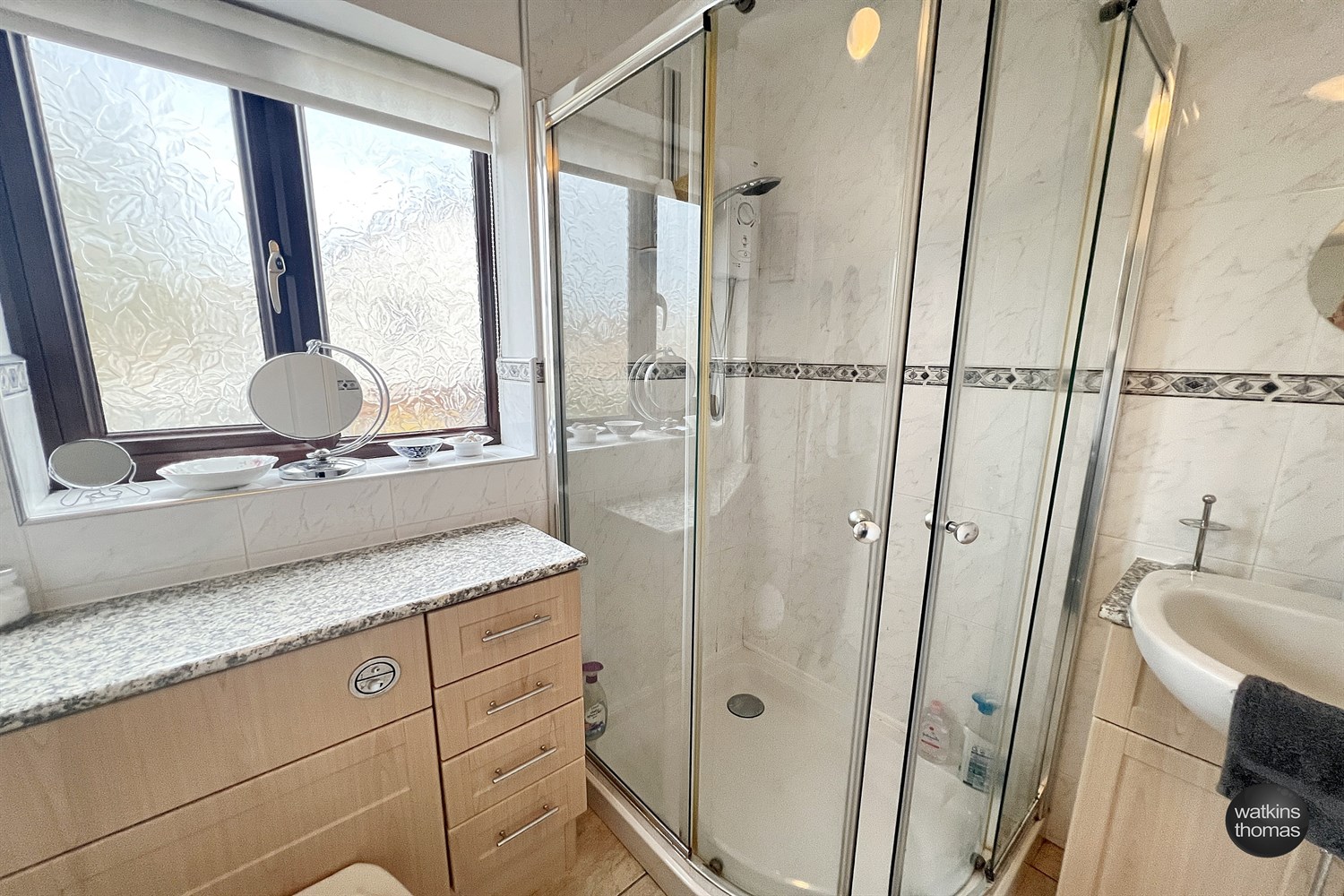 With rear aspect double glazed window and suite comprising shower cubicle with electric shower, partially tiled wall surround, low flush WC, vanity wash hand basin, heated towel rail, light with shaver point and tiled flooring.