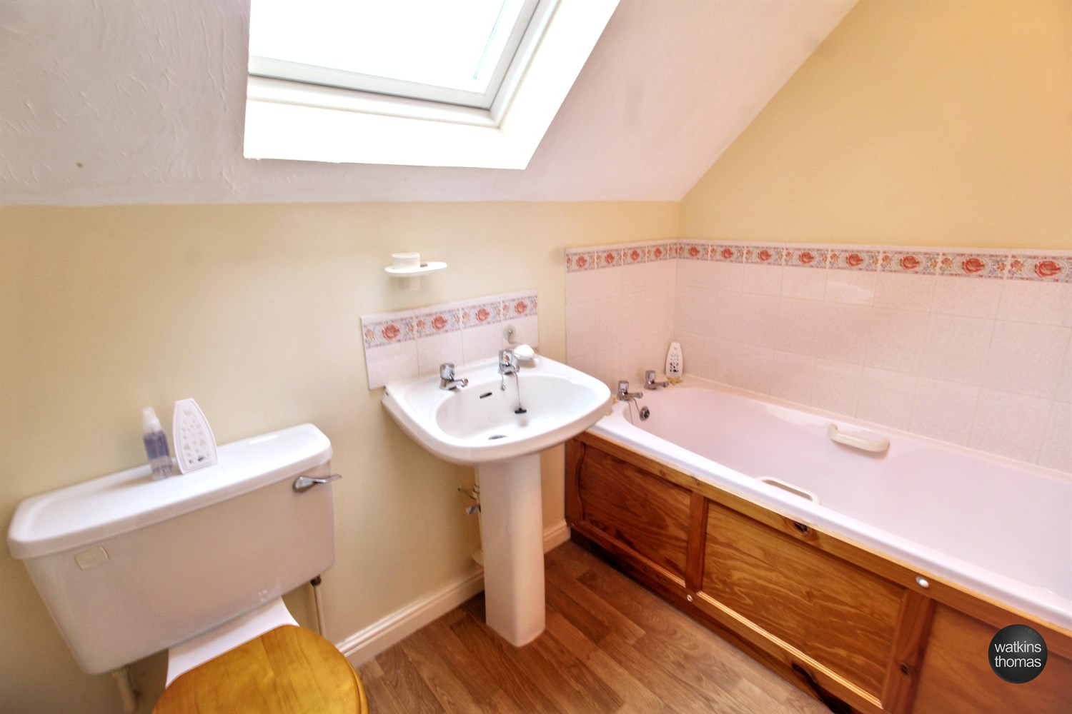 Irregular shaped room with rear aspect velux skylight, low flush WC, pedestal mounted wash hand basin with tiled splashbacks, panel enclosed bath, partially tiled wall surround, panelled radiator and reduced head height to one section of the room.