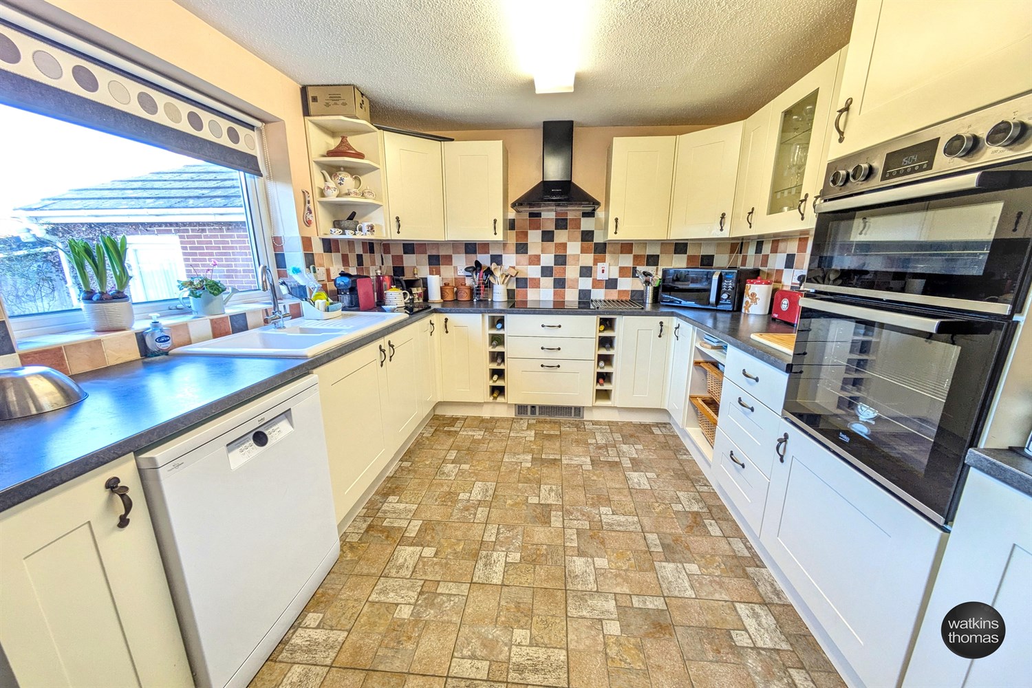 L shaped room with rear aspect double glazed window, a range of units comprising one and a half ceramic sink drainer with work surface, tiled splashback, base units under and matching wall units. Space for dishwasher, integrated electric double oven, electric induction hob with cooker hood over and remote controlled plinth heater below, panelled radiator, tiled flooring, dresser unit to dining area and rear aspect double glazed door and window to the rear garden.