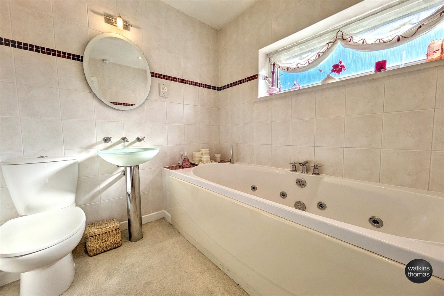 With front aspect double glazed window, suite comprising panel enclosed jacuzzi bath, feature wash hand basin, low flush WC, heated towel rail, fully tiled wall surround, extractor fan, shaver point and inset spotlights.