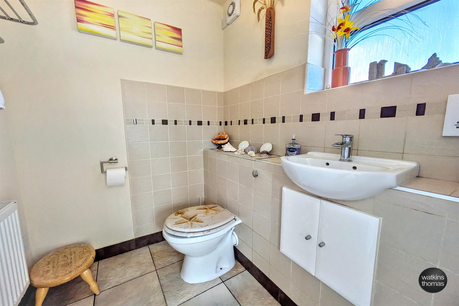 With side aspect double glazed window, low flush WC, vanity wash hand basin, panelled radiator, partially tiled wall surround, extractor fan and tiled flooring.