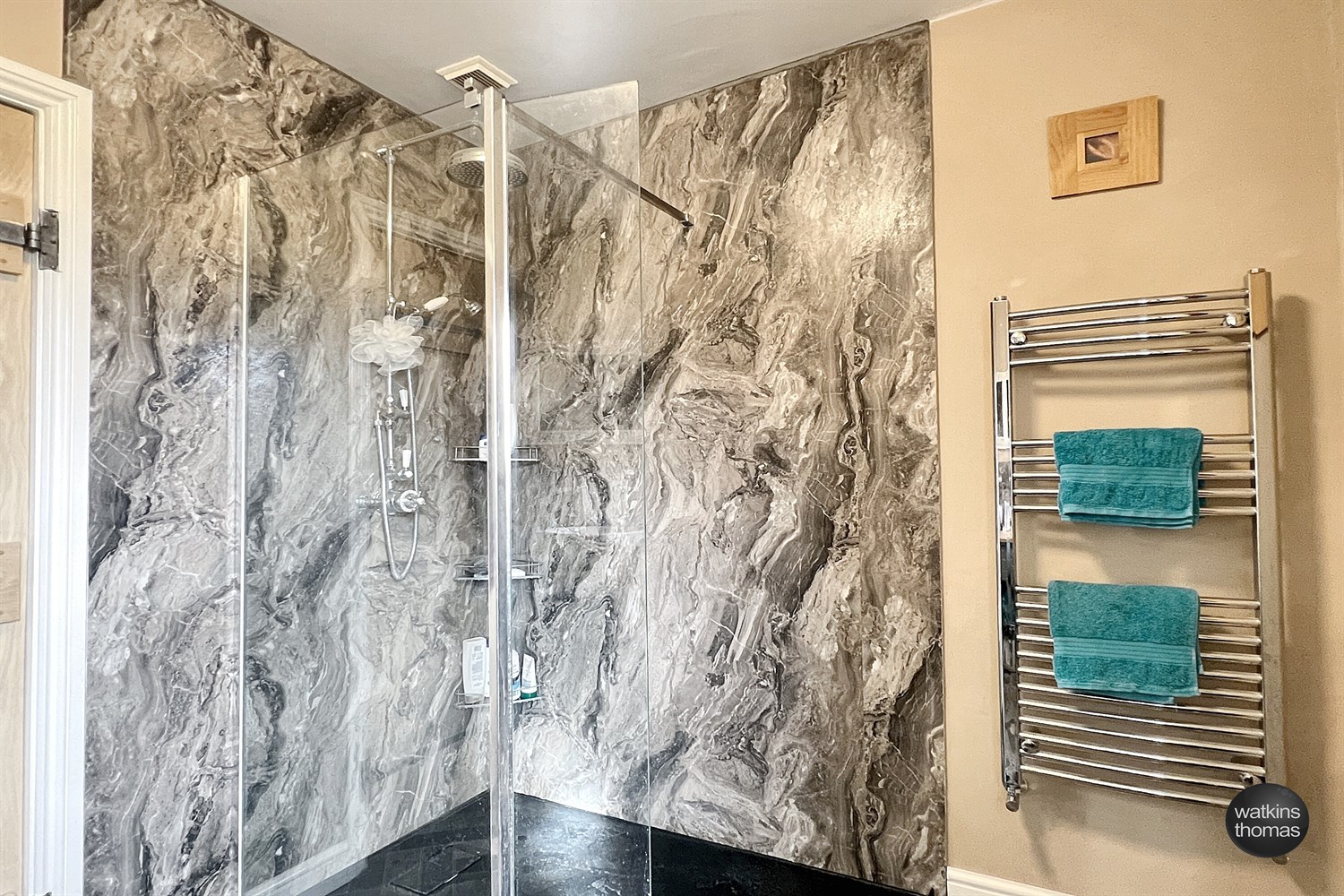 Recently installed and with white suite comprising shower tray with marble effect shower boarding to walls, twin headed shower unit and screen, low level WC and wash bowl with taps over and set on a wooden stand with drawer below. Double glazed window, extractor unit, ladder type radiator and further contemporary style radiator.