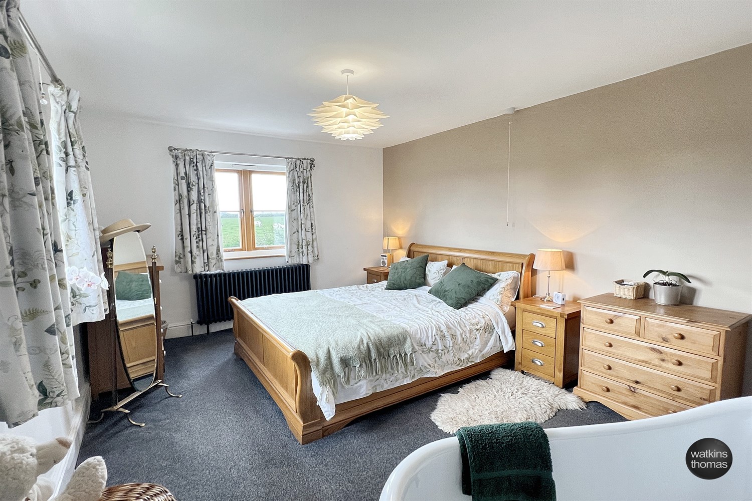 Open from the bedroom and having a slipper bath with mixer tap and low level WC on wooden stand. Part timber panelled walls. Over the WC there is a wash basin. Contemporary style radiator.