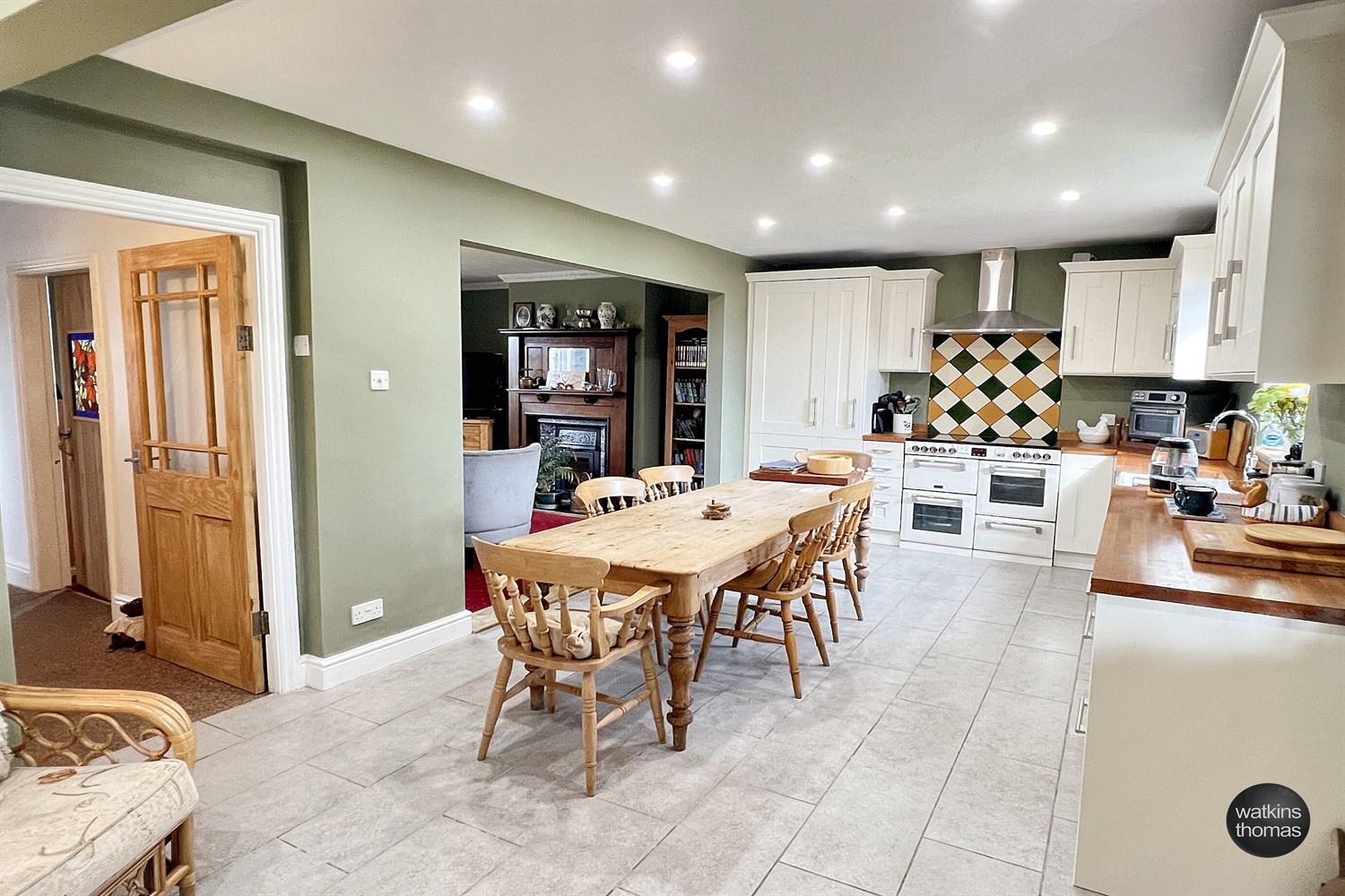 With stairway off, radiator and with a multi pane door to the breakfast area and feature oak doors with coloured autumn leaded glass panels to the living room and the;