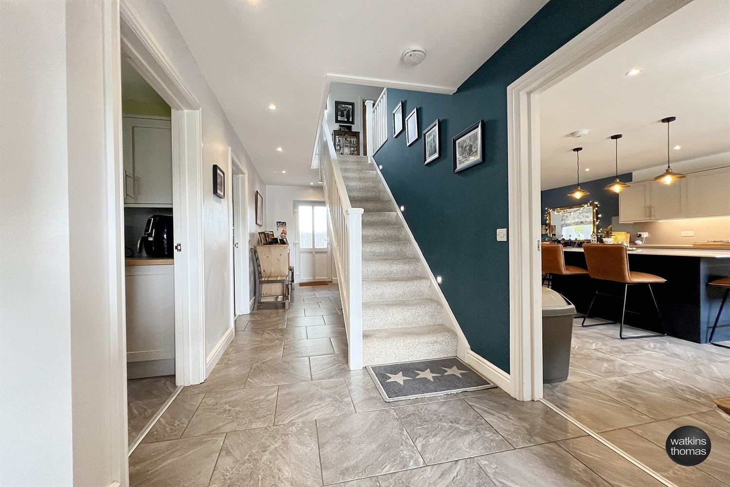 Approached through a composite door with double glazed leaded upper panels, double glazed window to the side, wall mounted thermostat and with an opening with a continuation of tiles through to: