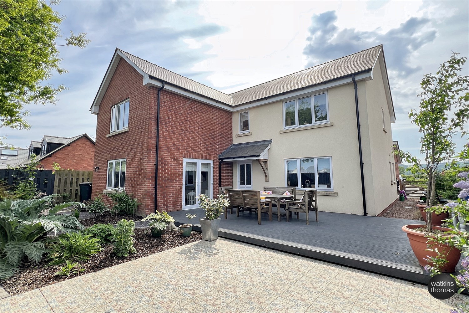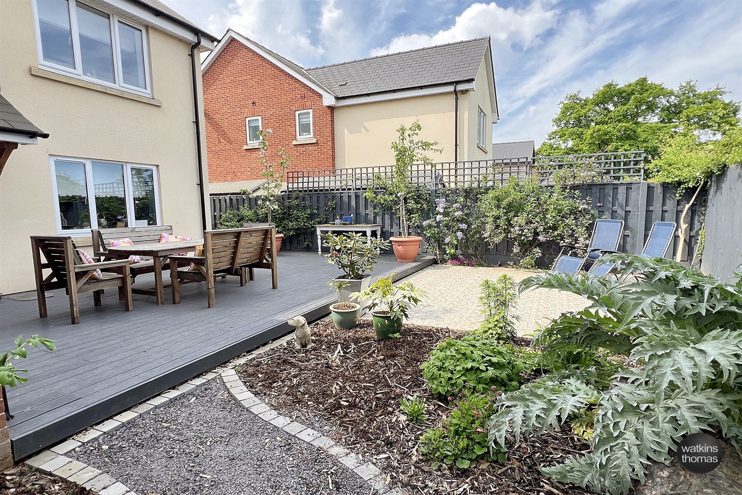 A road provides access to the tarmacadam driveway which is two car wide and two car deep. Adjacent to the driveway there is a stone border and to the left there is a decked platform. The decked area is surrounded by deep well stocked beds and borders. There is a 7'8 wide area at the side of the residence which is part laid to a pathway and part to a raised border. This runs to the rear garden which is a maximum of 27' deep by 46' wide. The rear garden area is provided for ease of maintenance and comprises a decked area ideal for entertaining. There is a tiled patio area and a pathway meanders through barked borders which are stocked with a wide variety of shrubs and plants. There is an outside light and the rear garden is extensively enclosed by board fencing. There is an outside tap