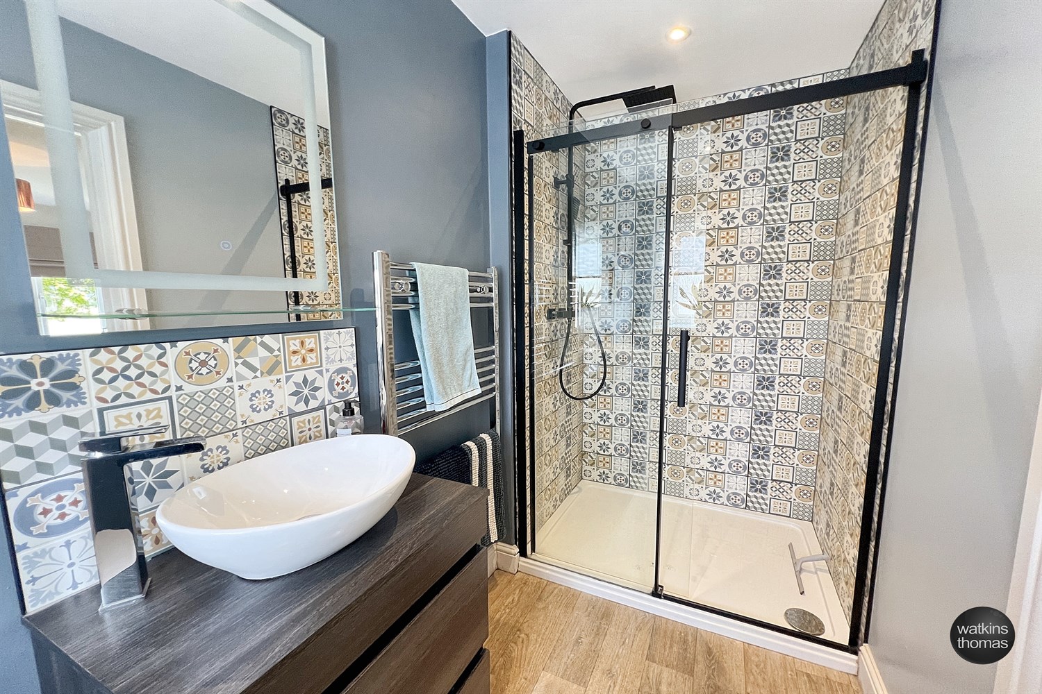 Beautifully appointed and with wide shower cubicle with feature tiled walls, twin headed shower unit, contemporary style wash basin with waterfall tap and bowl sink together with low level wc. There are tiled courses over the sink, sunken ceiling lights, extractor unit and double glazed window together with radiator.