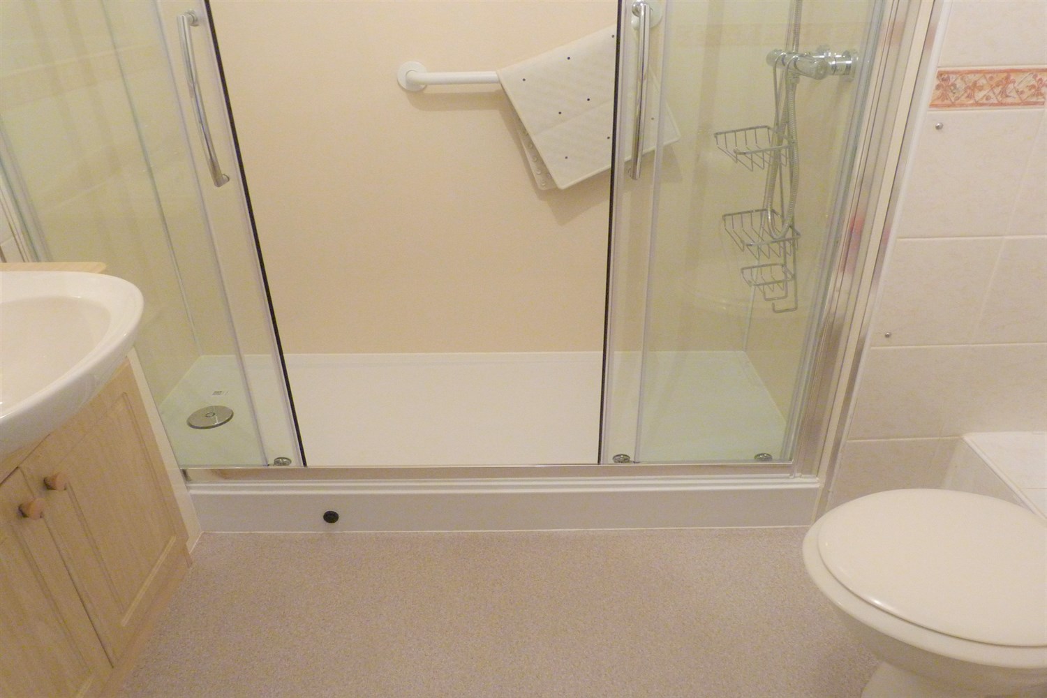 Coving to ceiling, fully tiled and shower boarded walls, electric towel radiator, dimplex wall heater, extractor fan, wash hand basin set in a vanity unit with double cupboard below, mirror over, light and shaver socket. Recently refitted double width shower cubicle with shower over, glass sliding doors, large grab handle, low level wc and emergency alarm button.
