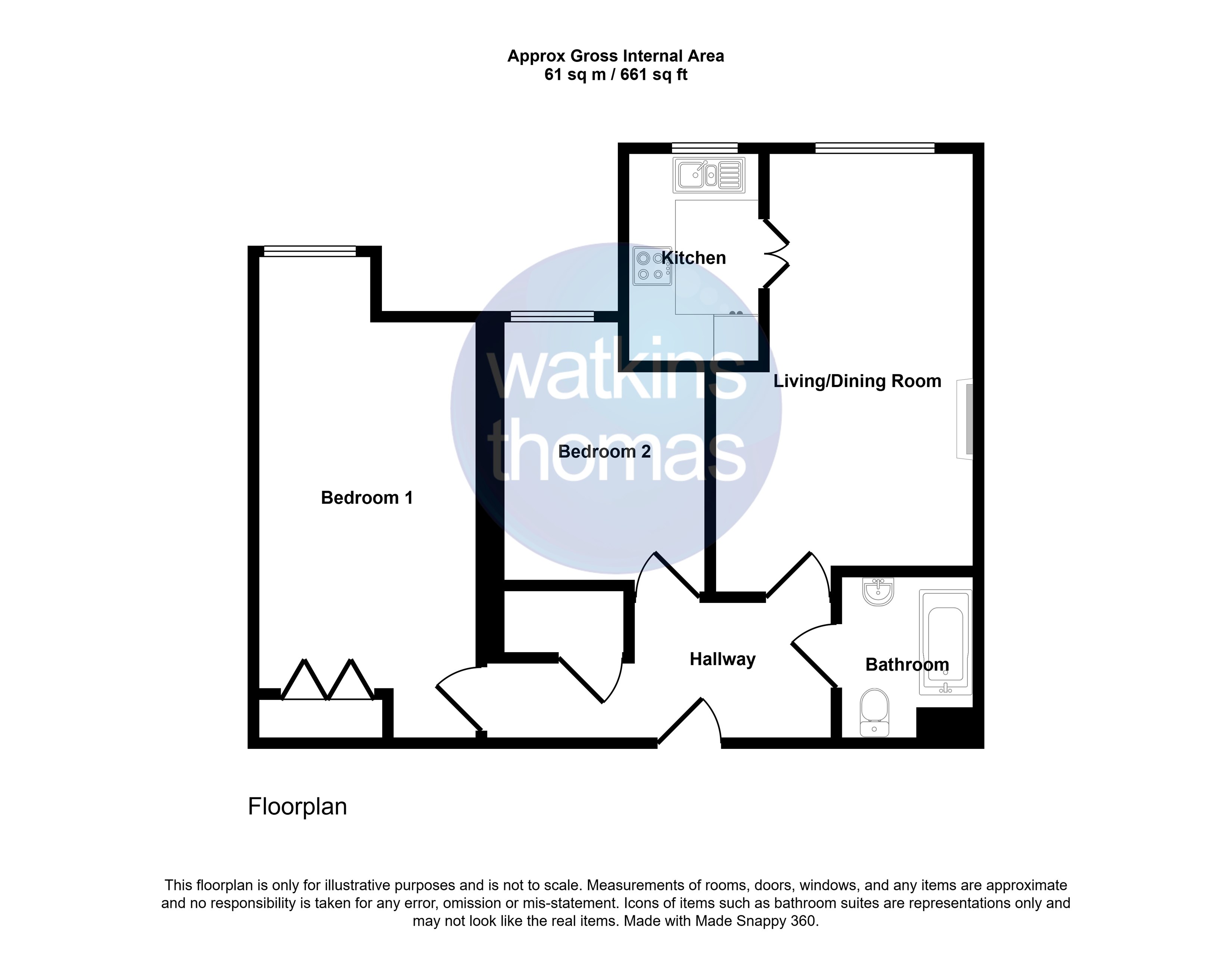 19 Watkins Court is a first floor apartment overlooking beautifully landscaped gardens from every window. The accommodation comprises entrance hall, living room, kitchen, two good sized bedrooms and a bathroom room. The property is provided with numerous emergency alarm cords, together with raised power points and lowered light switches and is intended for occupation for independent living for the over 60's. In more detail the accommodation comprises: