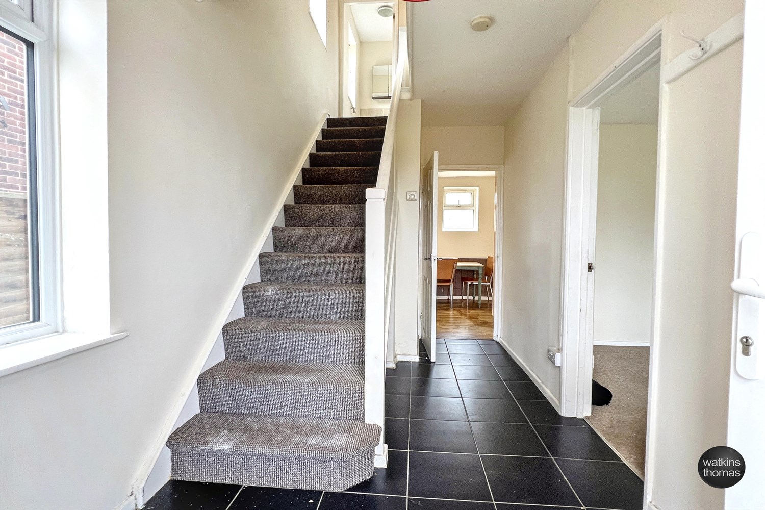 With a double glazed window to the side, stairway off, wall mounted thermostat, radiator, tiled floor, door to kitchen and door to: