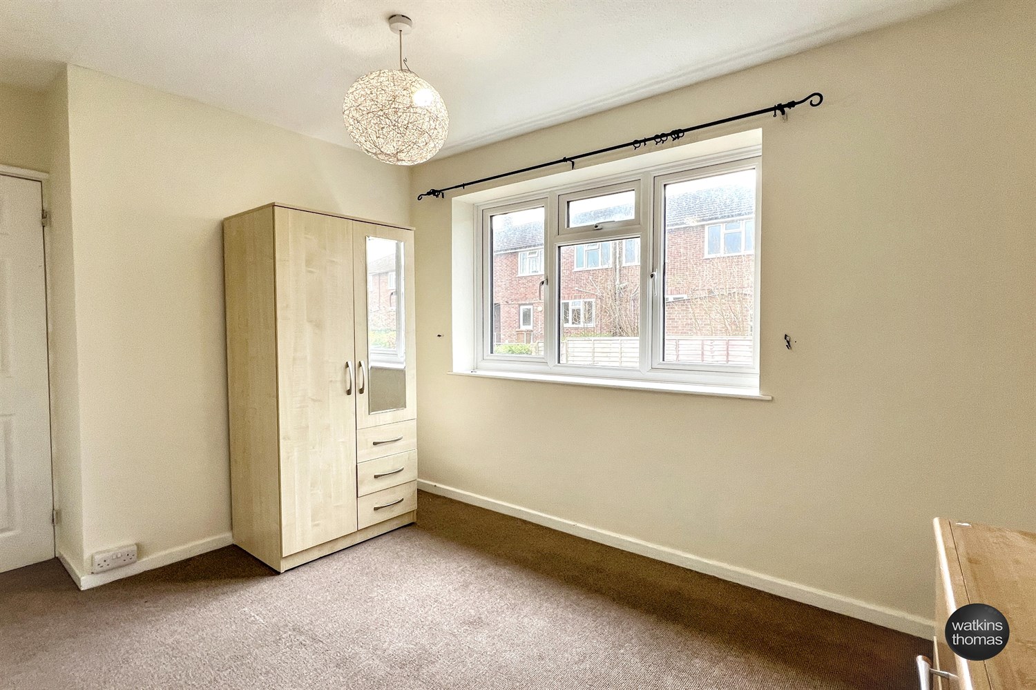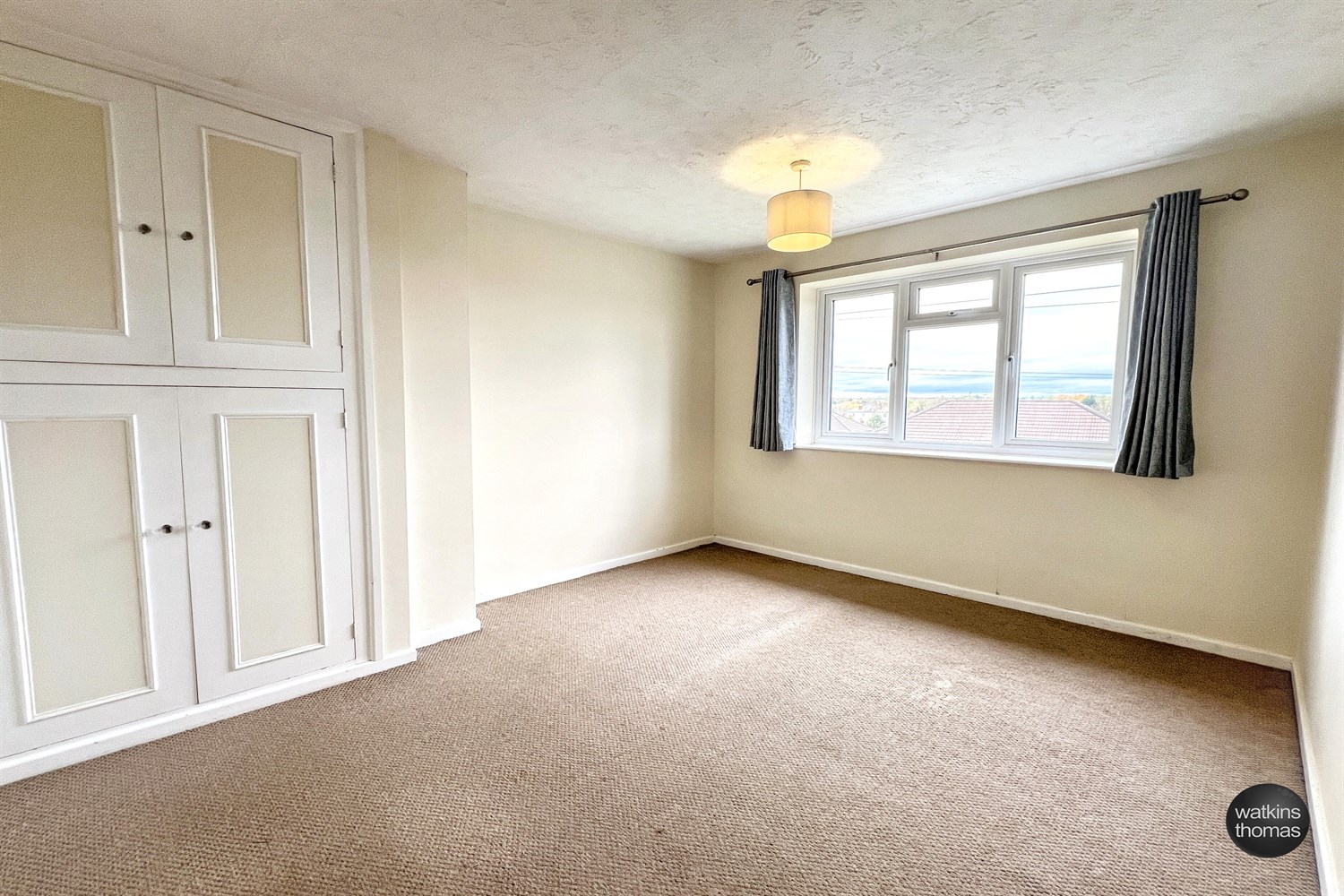 With a double glazed window to the front overlooking rooftops to the edge of town and rising countryside in the far distance. Radiator and door to double cupboard with radiator and double cupboard over.