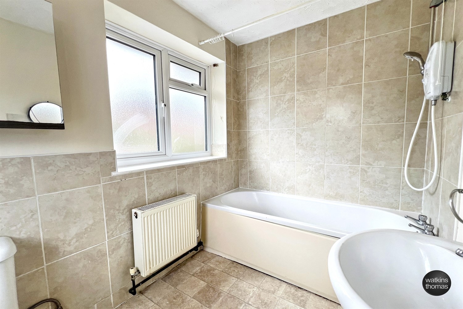 With tiled part tiled walls and suite comprising bath with electric shower over, pedestal wash basin and low level wc. Double glazed windows to two aspects. Radiator.