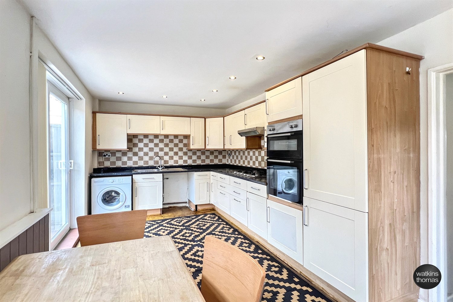 With a double glazed door and window to the side, double glazed window to the rear and sliding double glazed patio door to the rear. Sunken ceiling lights and fitted with base cupboard and drawer units with working surface over, up-stand and tiled walls together with an extensive range of eye level cabinets and with a single drainer sink unit with mixer tap, recess with plumbing for washing machine, space for dishwasher and with a built-in electric double oven and built-in fridge and freezer. Radiator and meter cupboard.