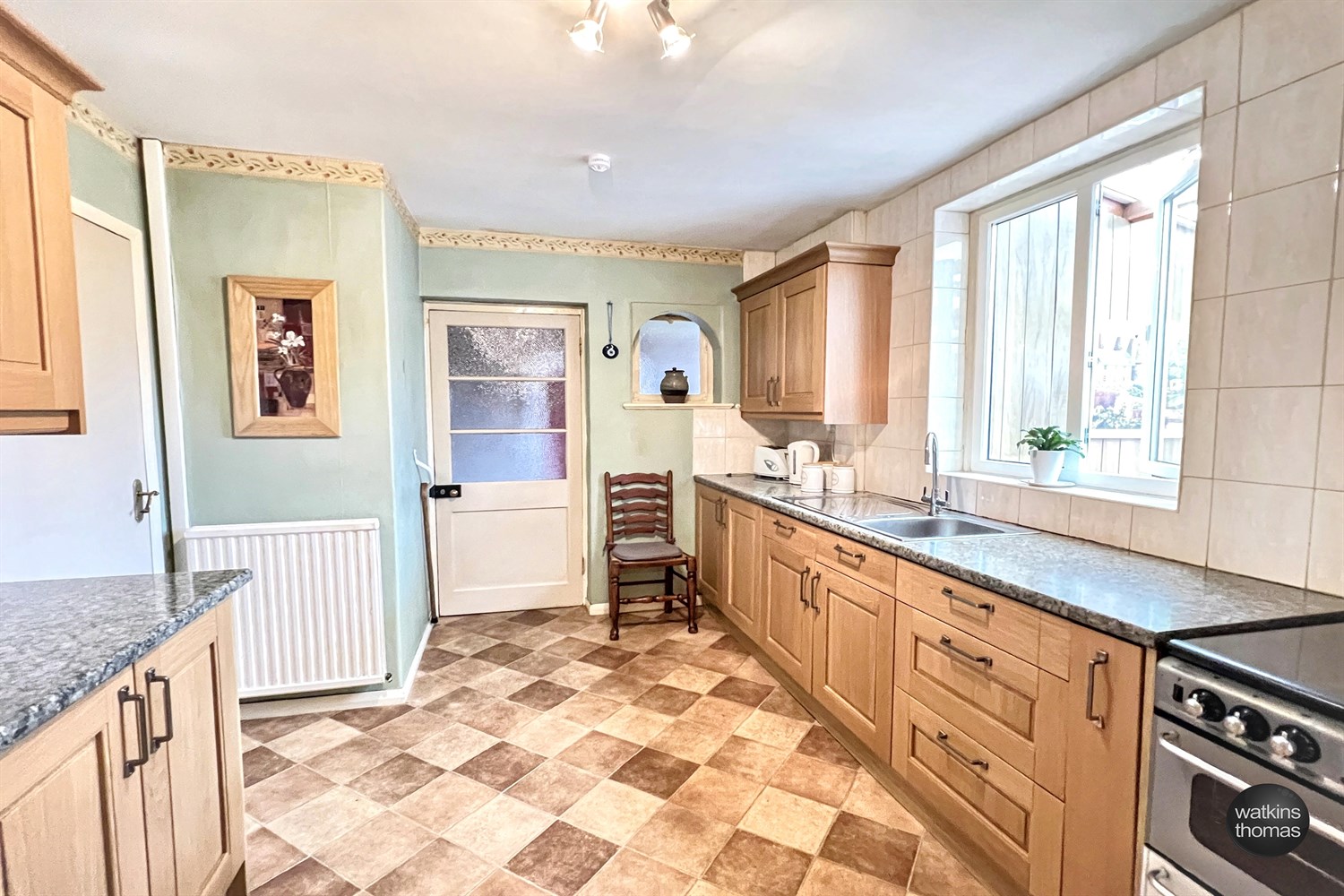 With a stainless steel single drainer sink unit with mixer tap, extensive range of wood fronted base cupboards with roll edged working surfaces over, tiled surrounds and eye level cabinets. Recess for cooker, recess for fridge, radiator, television aerial point, door to inner hall and with a window to and door to side passage.