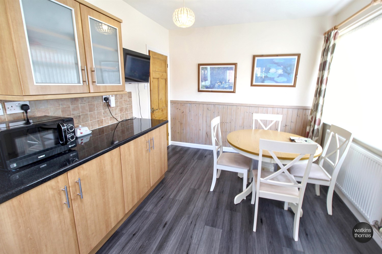 With side aspect double glazed window, panelled radiator, work surface with tiled splash backs, wall and base mounted units, smoke alarm, laminated flooring and access to the kitchen.