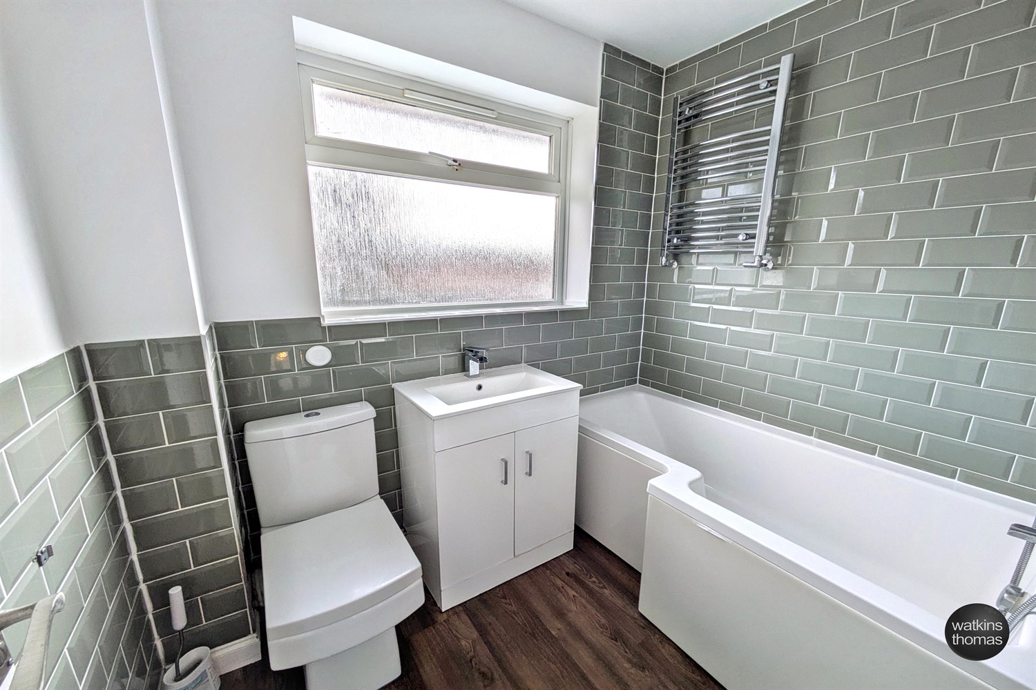 With rear aspect double glazed window, panel enclosed L-shaped bath with mixer tap, thermostatically controlled shower over with rain water showerhead, low flush wc, vanity wash hand basin, heated towel rail, extractor fan, partially tiled wall surround, inset spot lights and vinyl flooring.