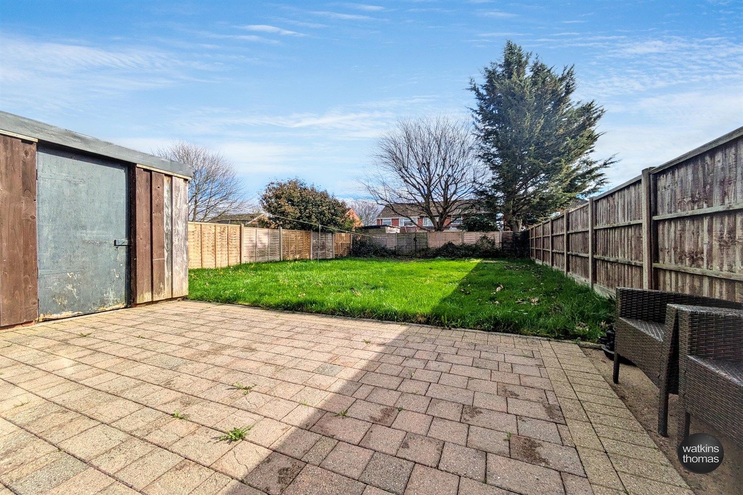 To the immediate rear of the property is a block paved patio leading to main garden which is laid to lawn. The garden is enclosed by fencing and has a useful STORAGE SHED/WORKSHOP (16'1 x 8'9) with electric roller door, power and lighting.