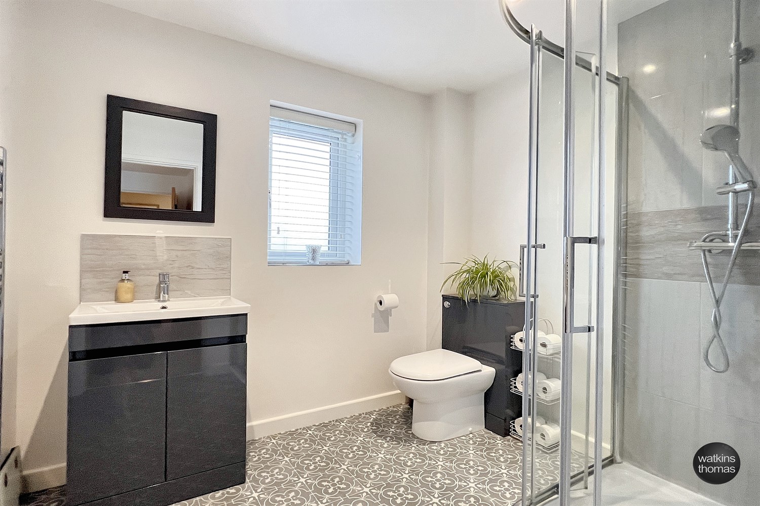 Beautifully appointed and with white suite comprising corner shower cubicle with ceramic wall tiles and twin headed, thermostatically controlled shower unit, low level WC and vanity wash basin with mixer tap, tile effect surround and cupboard below. Ladder type radiator, double glazed window and extractor unit.