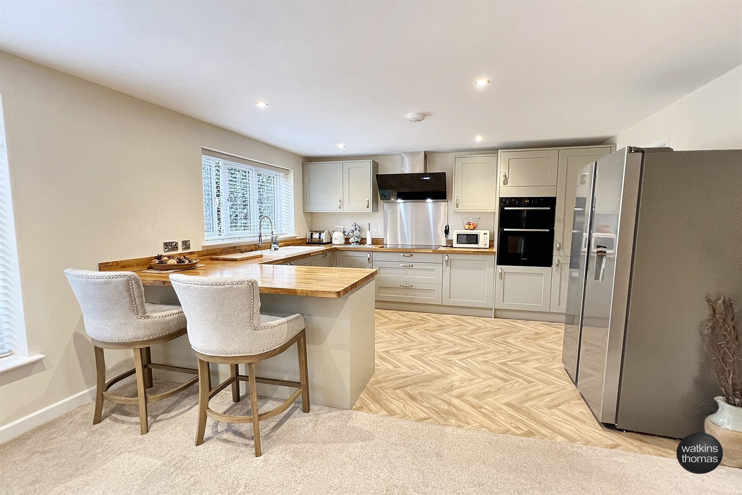 An exceptional room in terms of size and presentation and having double glazed french doors with adjacent windows opening to and overlooking the rear garden. Further deep window overlooking the rear garden and second double glazed window overlooking the garden. Sunken ceiling lights, part carpeted and part with wood grain effect flooring to the kitchen area which has soft close base cupboards and drawer units with wood block working surfaces over and upstand together with eye level cabinets and a tall larder cupboard with pull out shelves. Enamel one and a half bowl sink unit with drainer and flexible dual headed mixer tap. Built in dishwasher and a range master five ring electric hob with stainless steel splashback and cooker hood over. This room also has a radiator with cover, door to utility room and with a door to an under stair store cupboard in which are housed the control units for the solar panels.