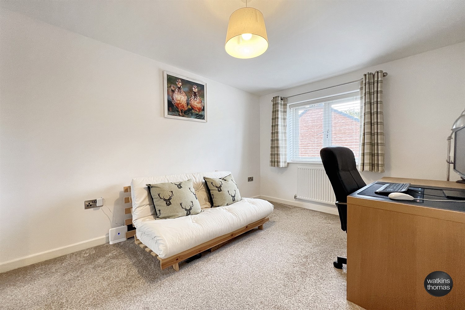 With a double glazed window to the front with blind and overlooking the cul de sac to treelined fields and rising countryside in the distance. Radiator. Along one wall there are four sliding doors, two of which are mirror fronted, to the wardrobe area. Television point.