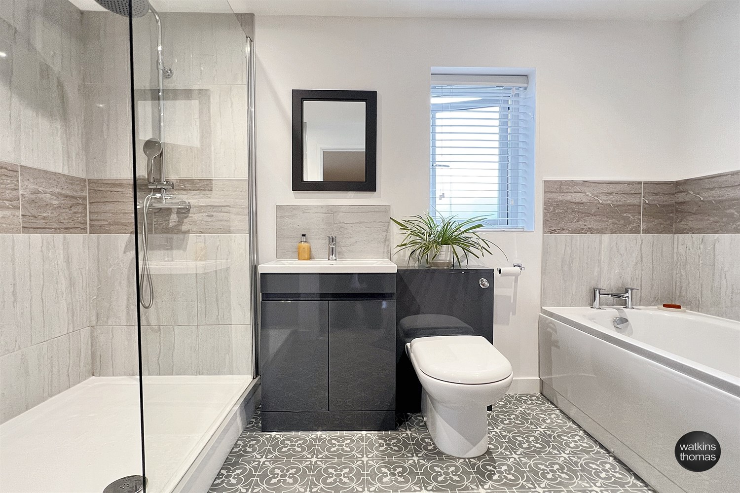 With four piece suite comprising bath with deep feature tiled courses over and mixer tap, wide and deep shower cubicle with tiled walls and twin headed thermostatically controlled shower unit, vanity wash basin with cupboards below, tiled courses over and low level WC. Extractor unit, double glazed window and ladder type radiator.