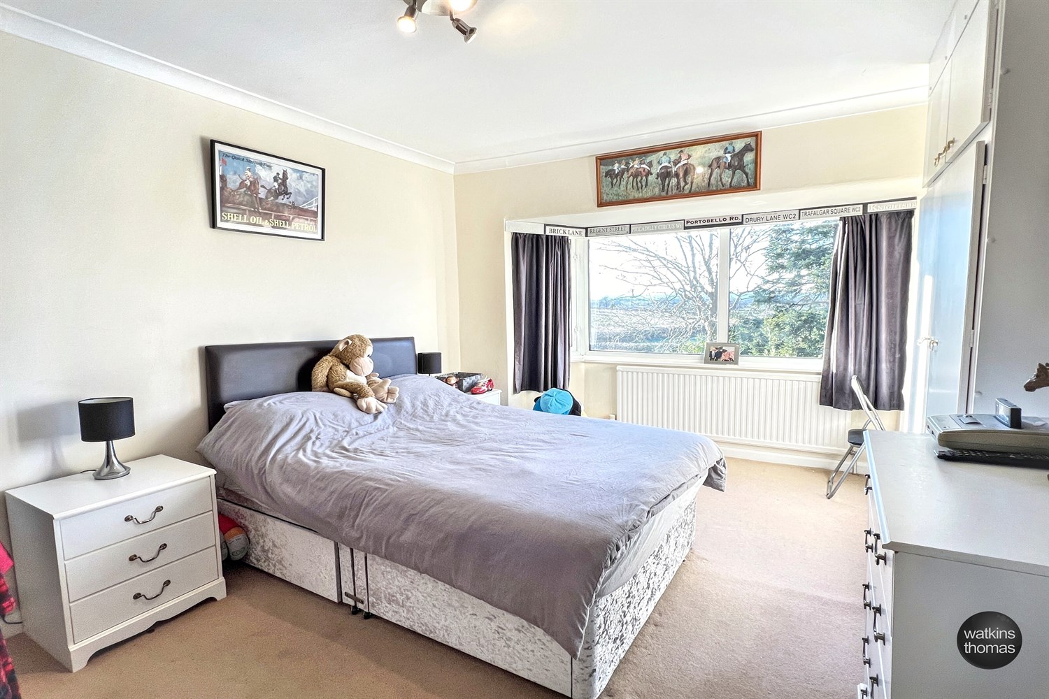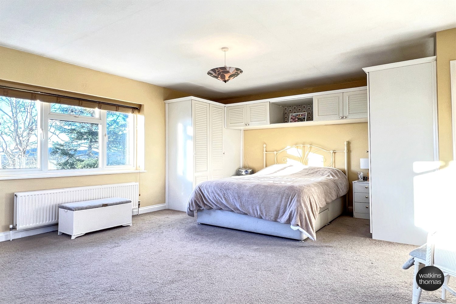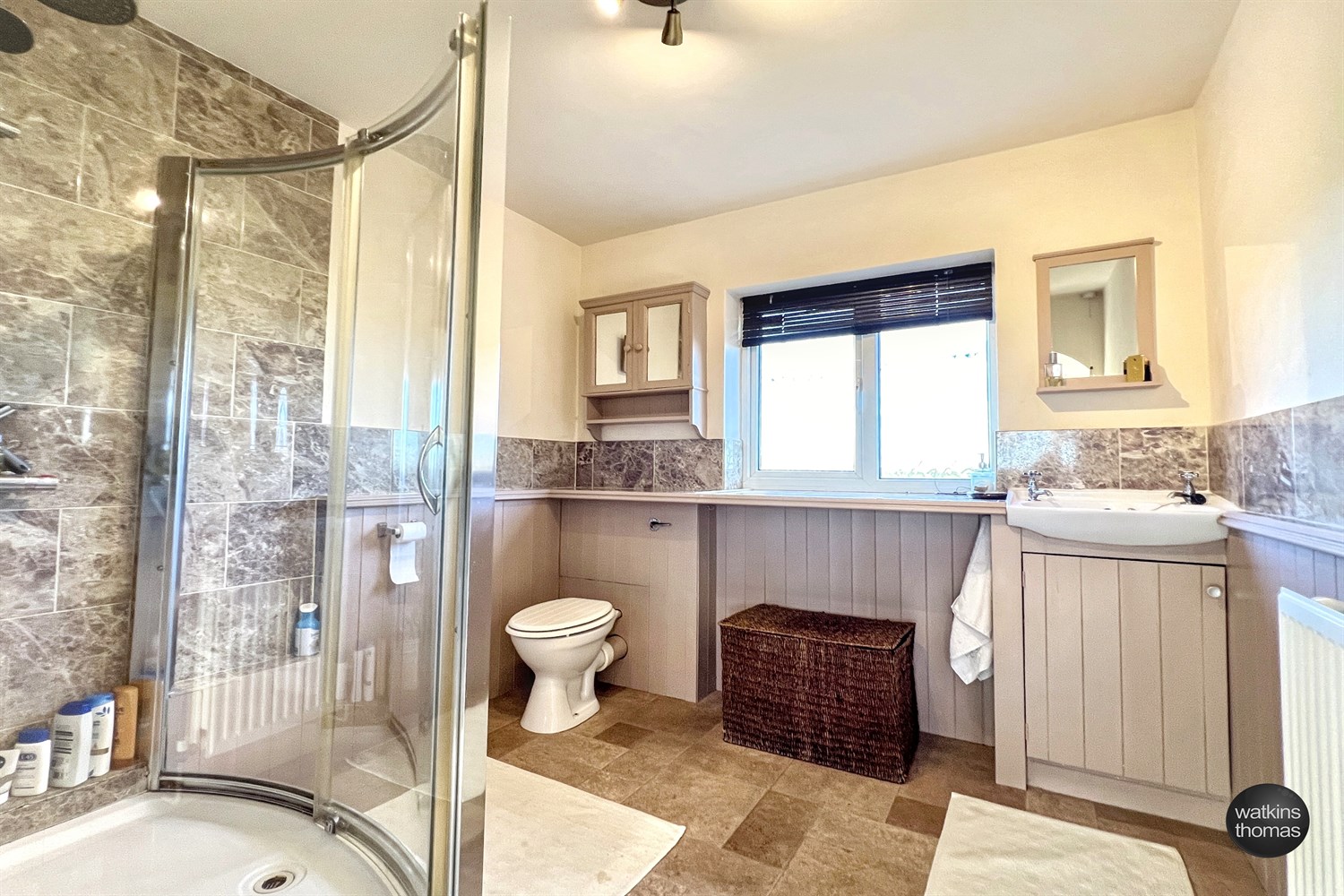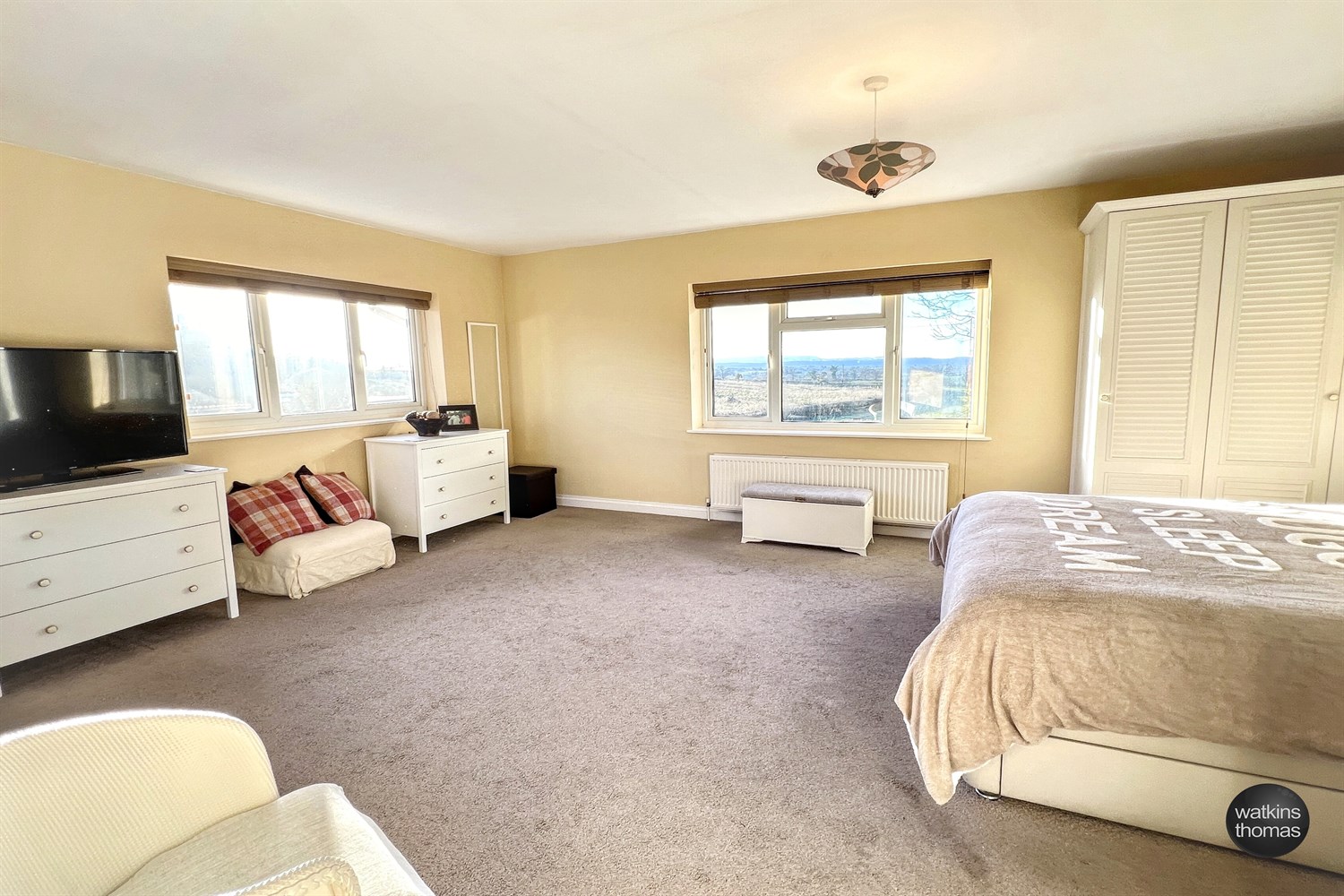 An exceptional room in terms of its overall space and the view that it enjoys from the front through a double glazed window across Herefordshire countryside to Hay Bluff and Welsh Hills in the distance. Double glazed window to the side and with a pair of sliding patio doors to a balcony. Radiator, fitted wardrobes and high level cabinet. Pair of doors to;