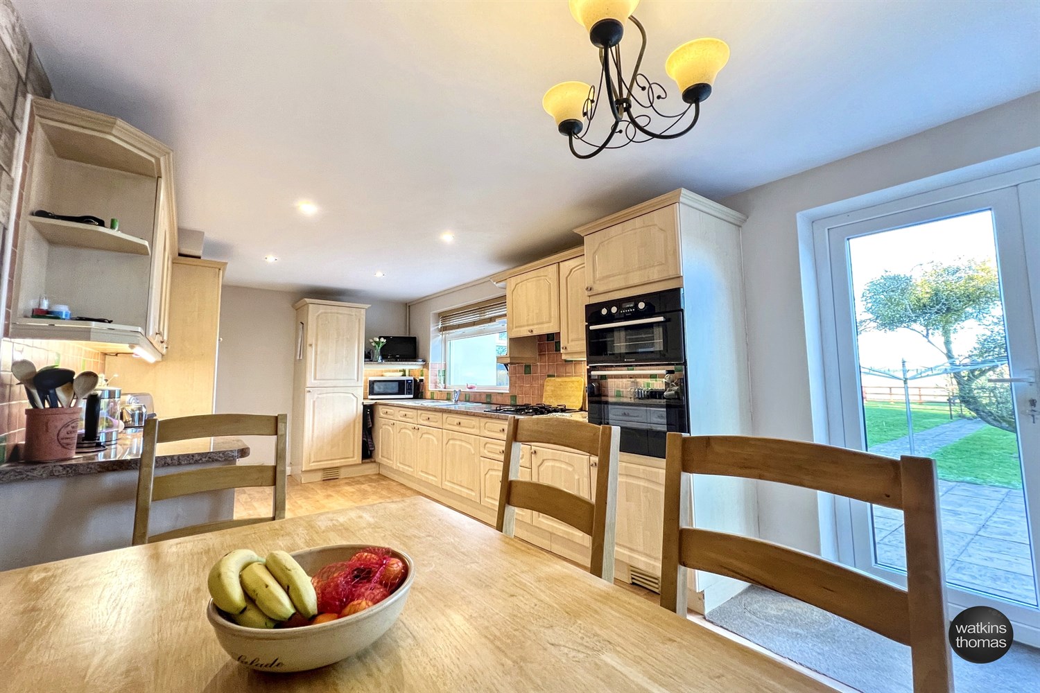 With a double glazed window enjoying the view across the garden at the rear, a pair of double glazed doors opening to and overlooking the rear garden. Radiator, wood grain effect flooring and fitted base cupboards and drawer units with roll edge working surface over, tiled surrounds and matching eye level cabinets including glass fronted units and display ends. Tall matching cupboard, double electric oven, four ring gas hob with cooker hood over and one and a half bowl stainless steel sink unit with drainer and mixer tap. Sunken ceiling lights. Radiator. Door to;