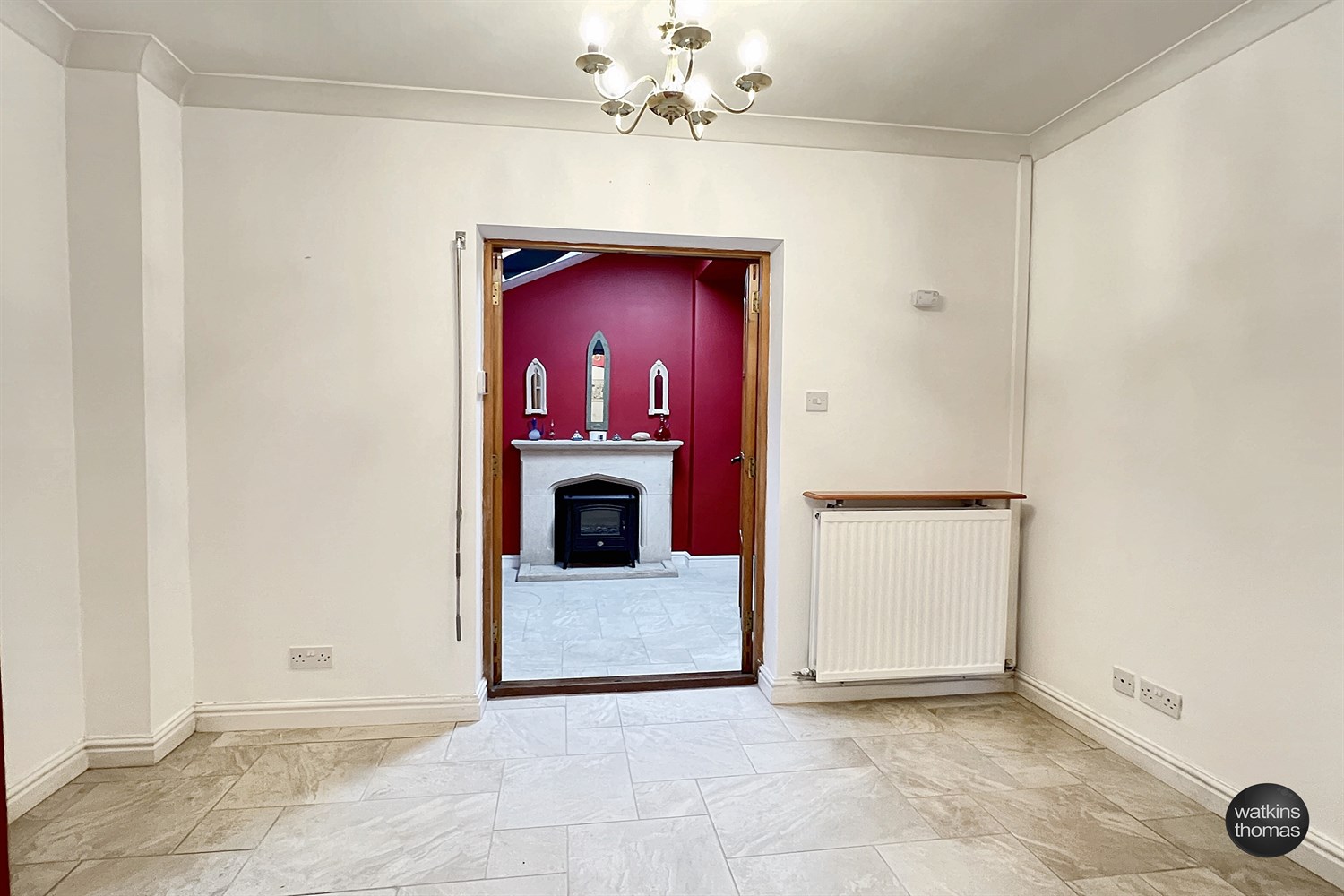 With coving to ceiling, radiator and a pair of doors through to: