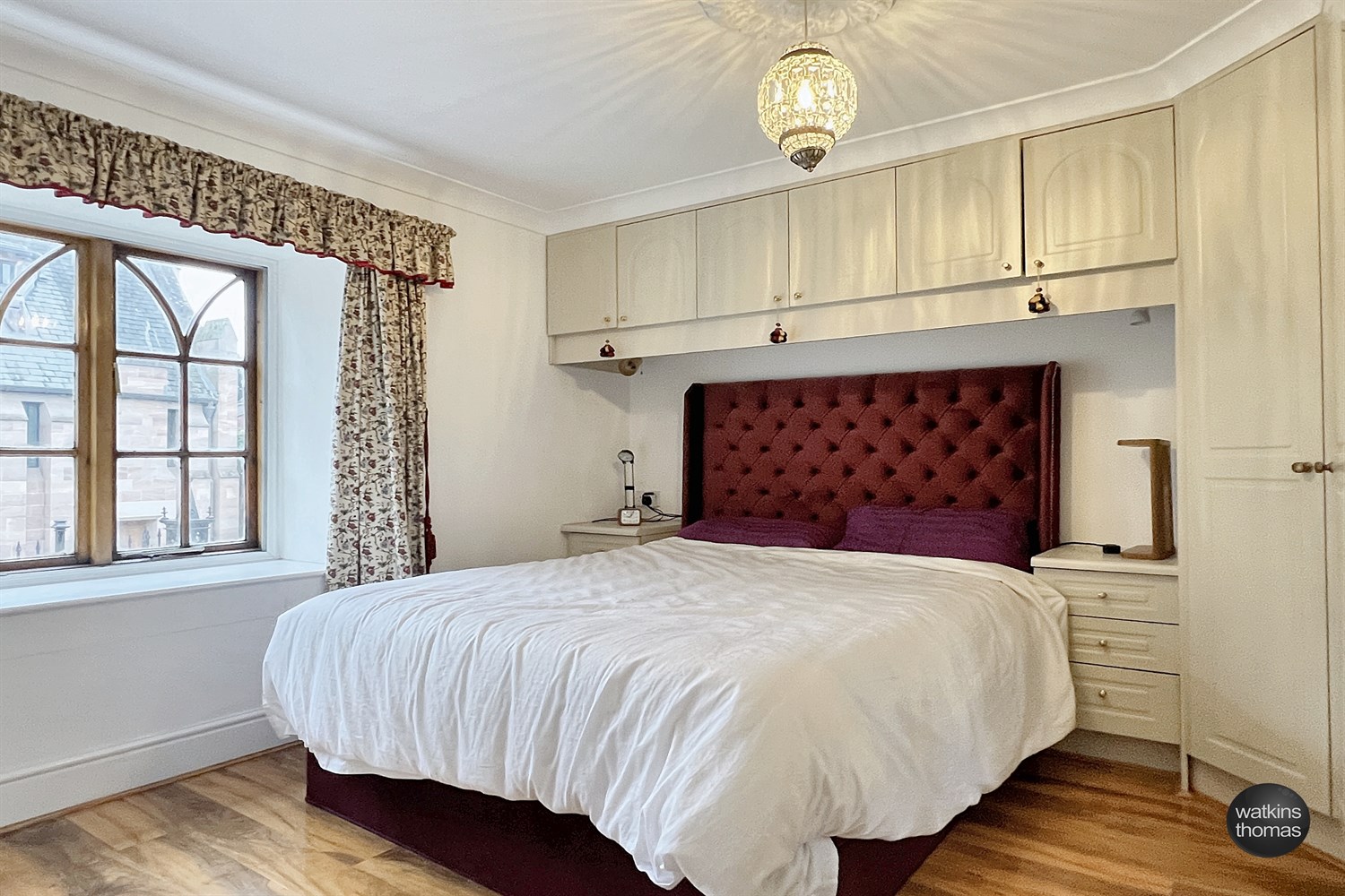 With a double glazed window enjoying the full view to Hereford's Cathedral and The Chained Library, coved ceiling, radiator, wood laminate flooring and with fitted wardrobe cupboards with cabinets over the bed recess and bedside drawer units.
