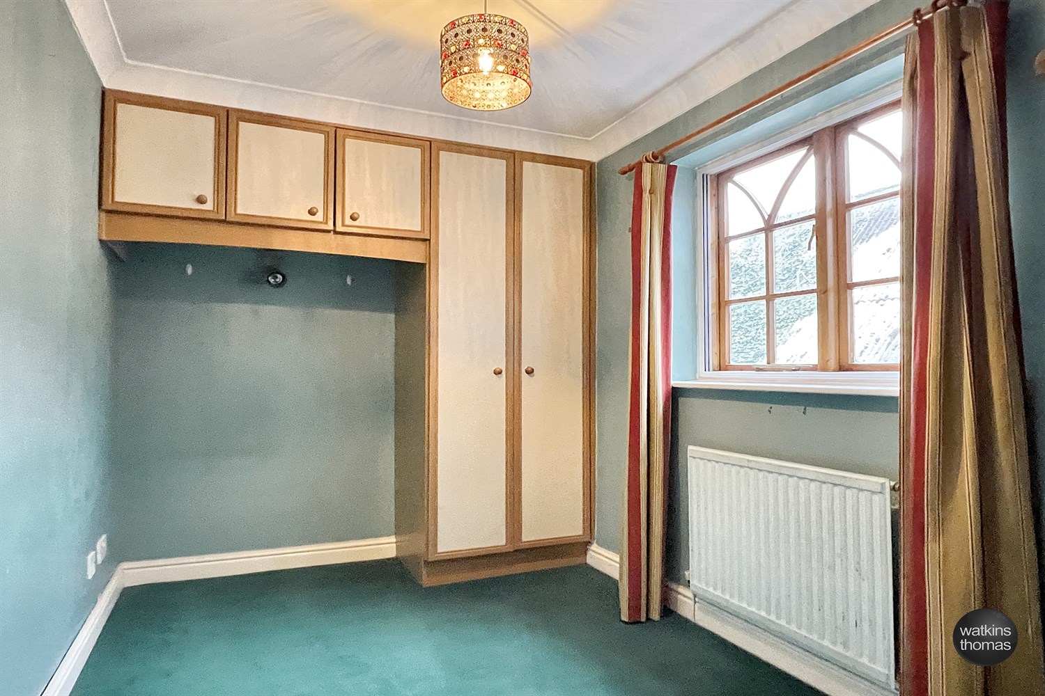 With a window to the rear, coved ceiling, radiator and double wardrobe cupboard with cabinets over a bed recess.