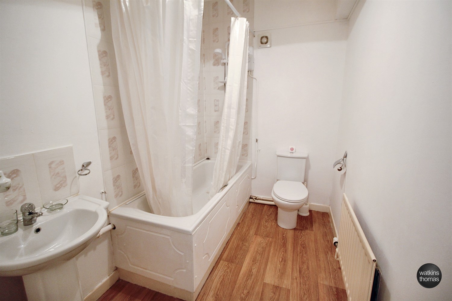 With panel enclosed bath with electric shower over, pedestal mounted wash hand basin, low flush wc, extractor fan, panelled radiator and vinyl flooring.