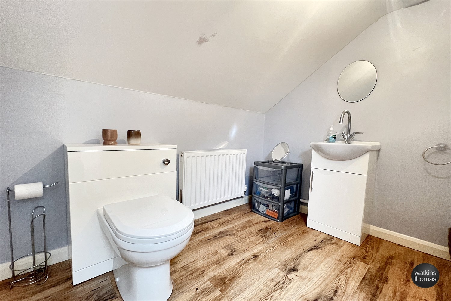 With low level WC, wash basin with mixer tap, radiator, wood laminate flooring and door to an eaves storage cupboard. Extractor vent.