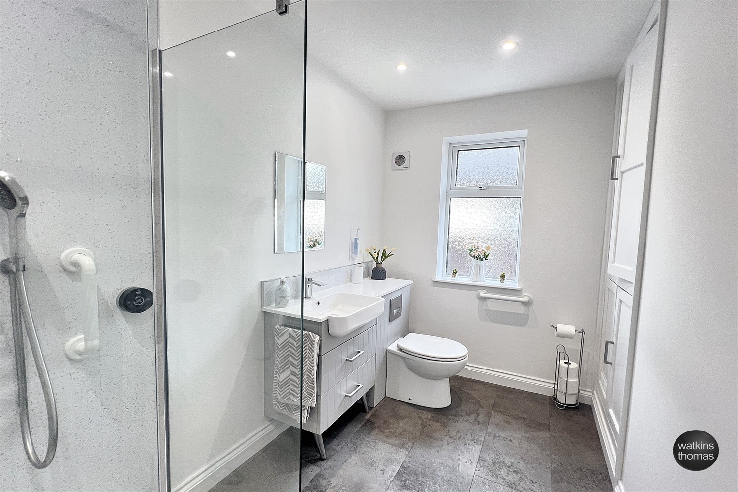 With white suite comprising walk in shower cubicle with a thermostatically controlled shower unit, vanity wash basin with mixer tap and cupboards below, together with WC. Double glazed window, radiator, wall mounted electric heater and doors to boiler cupboard with a wall mounted modern gas fired boiler which provides central heating and domestic hot water.