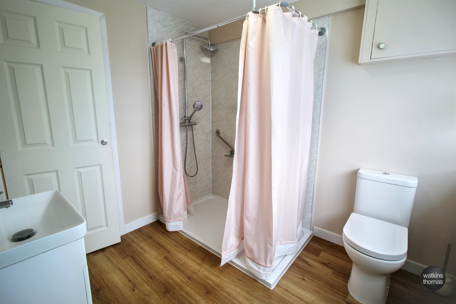 With double shower cubicle with shower curtain, thermostatically controlled shower with rainwater shower head, low flush wc, vanity wash hand basin, part shower boarded surround, panelled radiator, vinyl flooring and door to the entrance hall.